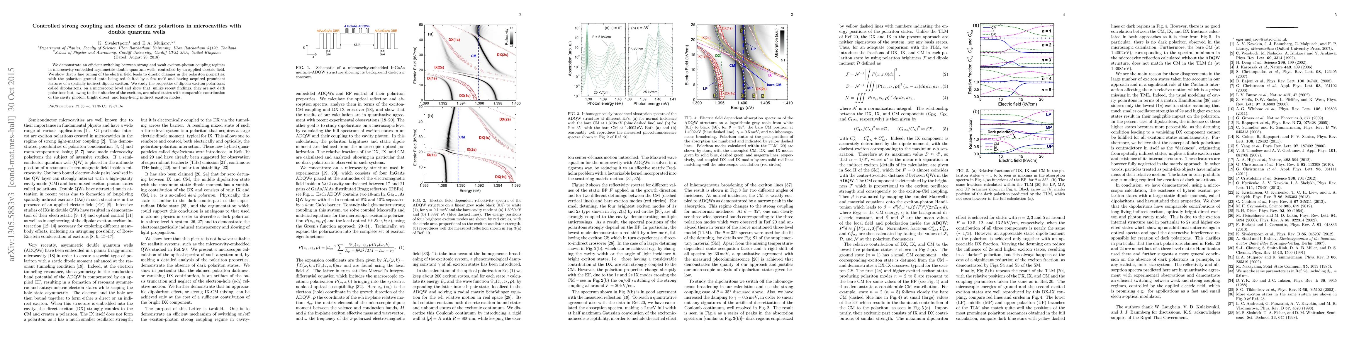 We demonstrate an efficient switching between strong and weak exciton-photon coupling regimes in microcavity-embedded asymmetric double quantum wells, controlled by an applied electric field. We show that a fine tuning of the electric field leads to drastic changes in the polariton properties, with the polariton ground state being red-shifted by a few meV and having acquired prominent features of a spatially indirect dipolar exciton. We study the properties of dipolar exciton polaritons, called dipolaritons, on a microscopic level and show that, unlike recent findings, they are not dark polaritons but, owing to the finite size of the excition, are mixed states with comparable contribution of the cavity photon, bright direct, and long-living indirect exciton modes.