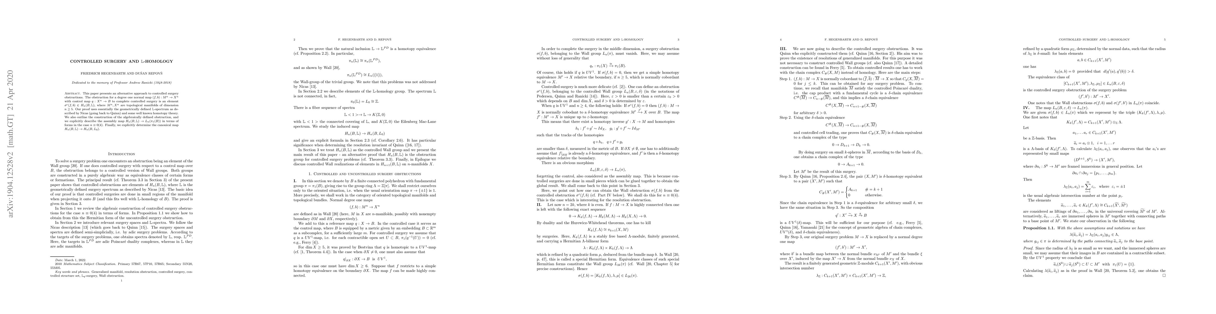 This paper introduces an alternative method for controlled surgery obstructions, showing that the obstruction is an element $\sigma^c (f, b) \in H_n (B, \mathbb{L})$, and uses Nicas' $\mathbb{L}$-spectrum and homotopy theory to prove this. The paper also details the assembly map and the canonical map in specific dimensions.