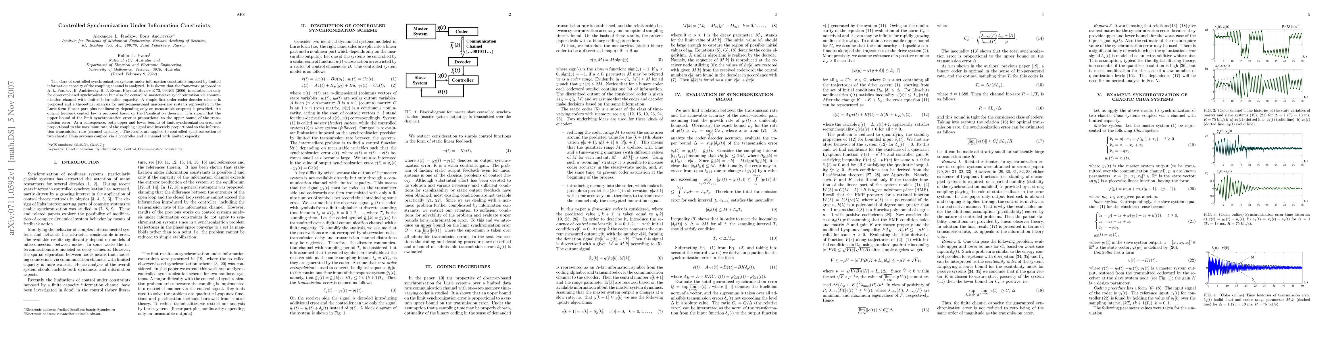 This paper analyzes controlled synchronization systems under information constraints due to limited coupling channel capacity. It proposes a first-order coder-decoder scheme and an output feedback control law based on the Passification theorem, demonstrating that synchronization error bounds are proportional to transmission error and inversely proportional to channel capacity.