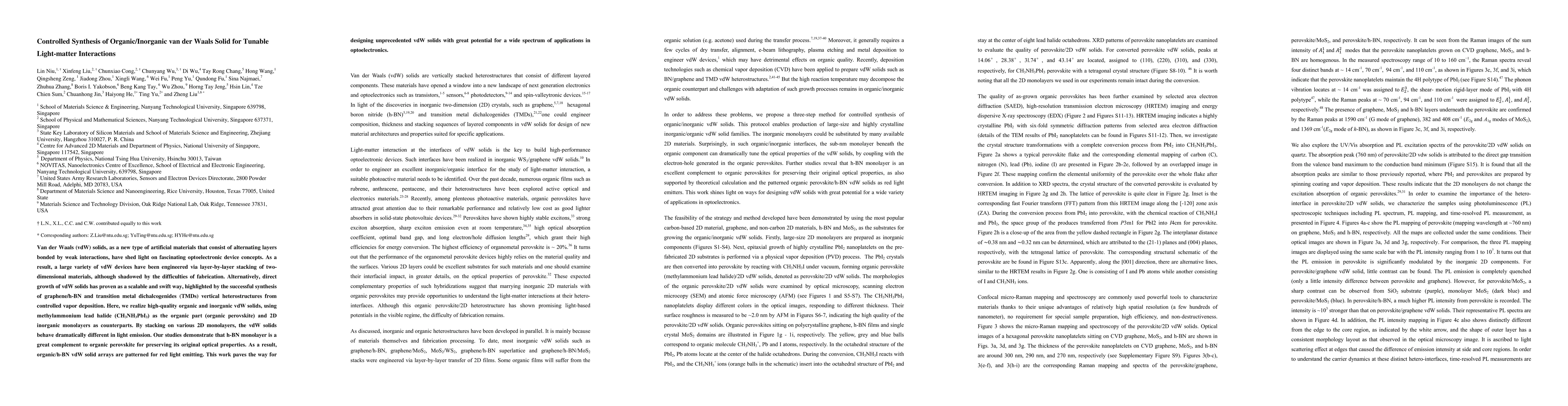 This paper reports the controlled synthesis of high-quality organic/inorganic van der Waals solids using methylammonium lead halide and 2D inorganic monolayers, demonstrating tunable light emission properties. The study finds that h-BN monolayers preserve the optical properties of organic perovskites, enabling the fabrication of red light-emitting vdW solid arrays, which holds promise for optoelectronic applications.