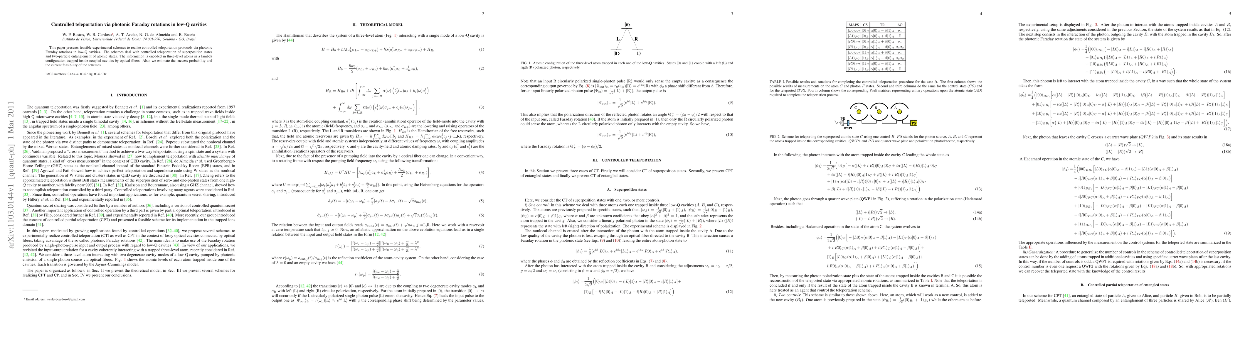 This paper proposes experimental schemes for controlled teleportation using photonic Faraday rotations in low-Q cavities, focusing on the teleportation of quantum superposition states and two-particle entanglement, with information encoded in three-level atoms. The study also assesses the success probability and current feasibility of these schemes.