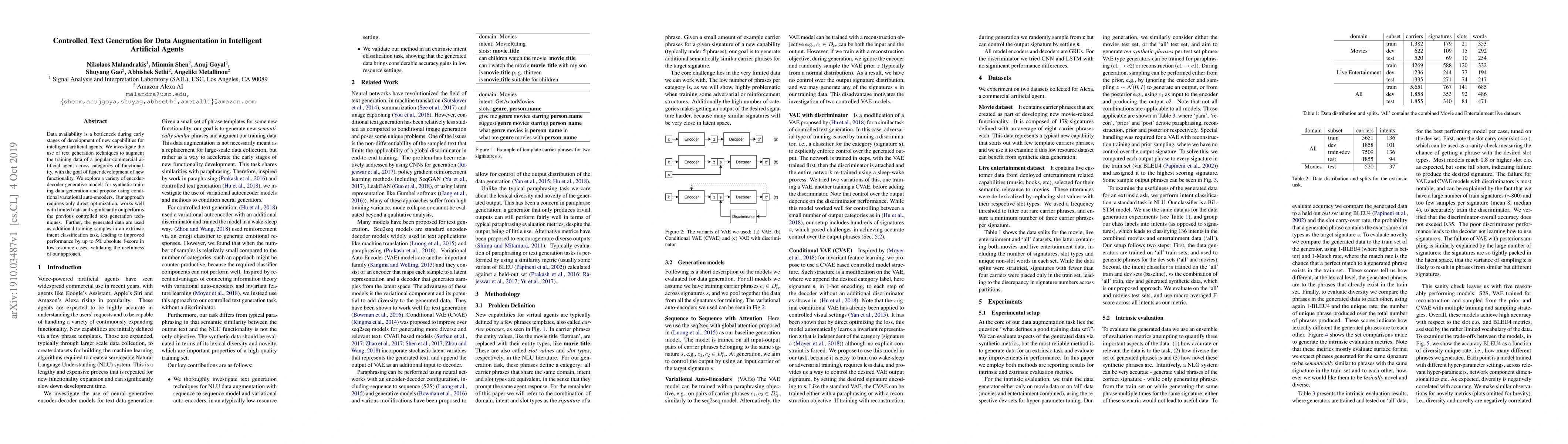 Data availability is a bottleneck during early stages of development of new capabilities for intelligent artificial agents. We investigate the use of text generation techniques to augment the training data of a popular commercial artificial agent across categories of functionality, with the goal of faster development of new functionality. We explore a variety of encoder-decoder generative models for synthetic training data generation and propose using conditional variational auto-encoders. Our approach requires only direct optimization, works well with limited data and significantly outperforms the previous controlled text generation techniques. Further, the generated data are used as additional training samples in an extrinsic intent classification task, leading to improved performance by up to 5\% absolute f-score in low-resource cases, validating the usefulness of our approach.
