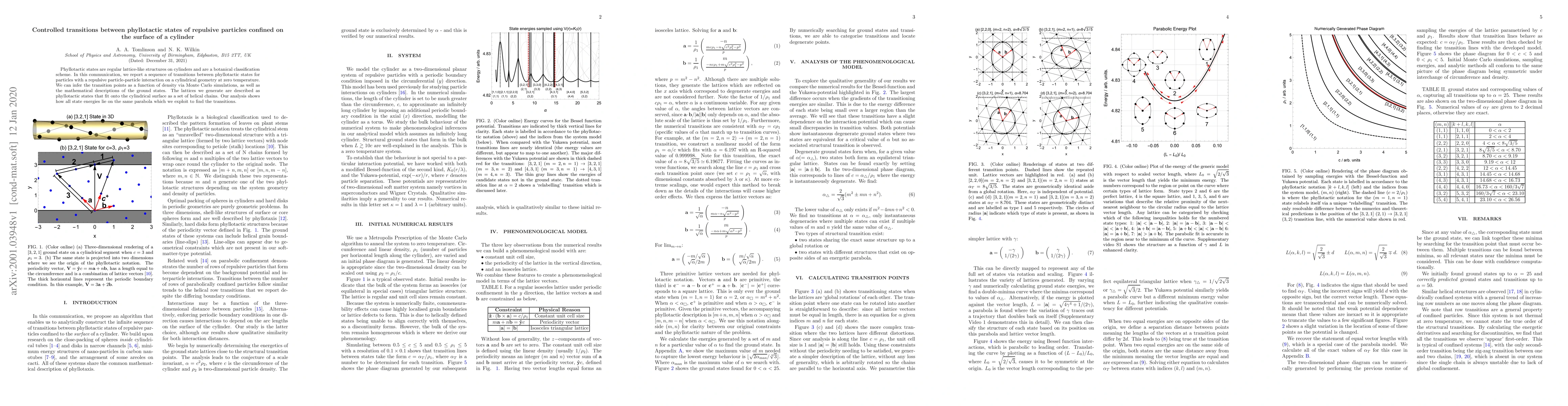 Phyllotactic states are regular lattice-like structures on cylinders and are a botanical classification scheme. In this communication, we report a sequence of transitions between phyllotactic states for particles with a repulsive particle-particle interaction on a cylindrical geometry at zero temperature. We can infer the transition points as a function of density via Monte Carlo simulations, as well as the mathematical descriptions of the ground states. The lattices we generate are described as phyllotactic states that fit onto the cylindrical surface as a set of helical chains. Our analysis shows how all state energies lie on the same parabola which we exploit to find the transitions.