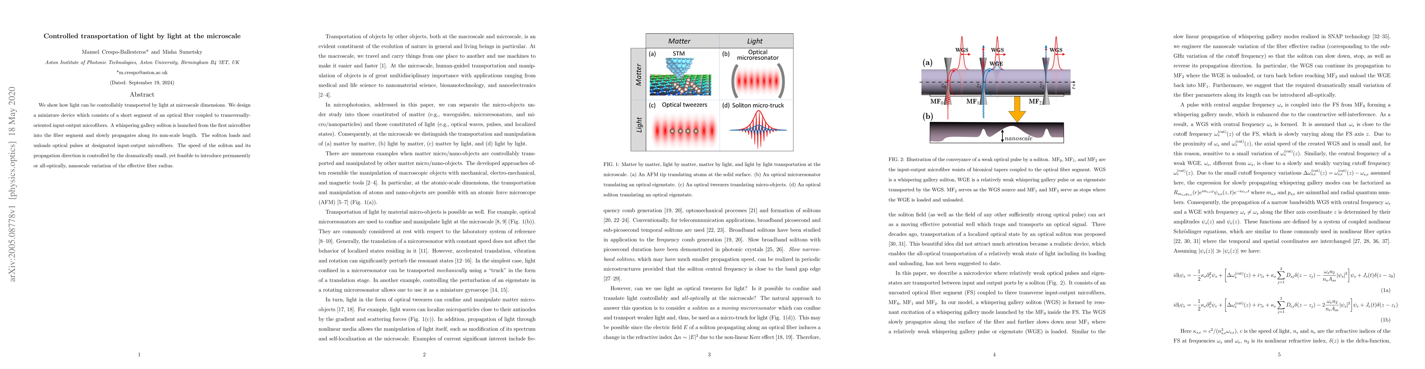 The paper presents a design for a microscale device that uses whispering gallery solitons to controllably transport light, controlled by nanoscale variations in the optical fiber's effective radius.