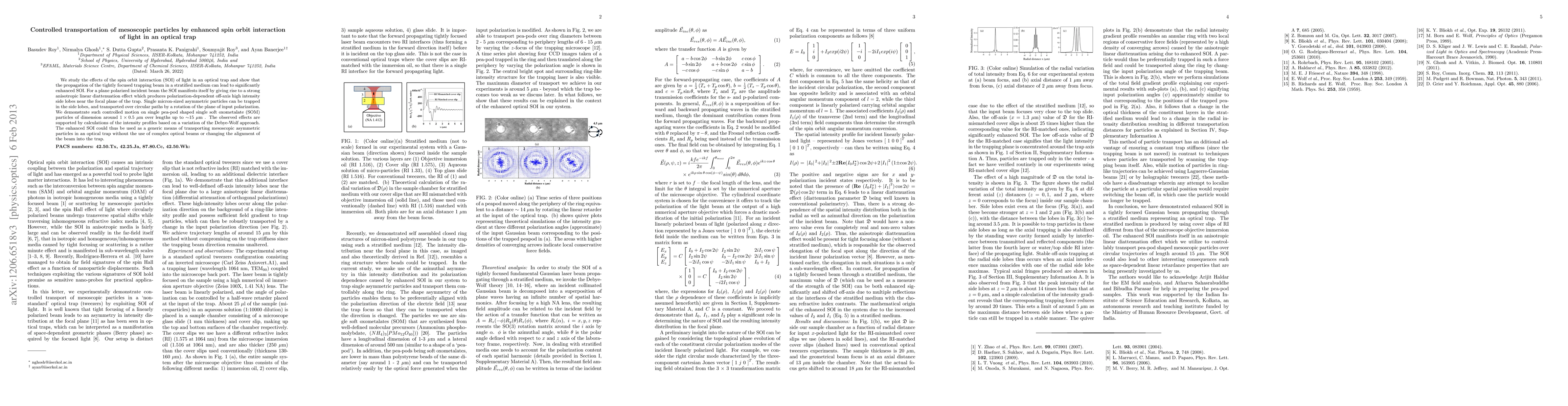 We study the effects of the spin orbit interaction (SOI) of light in an optical trap and show that the propagation of the tightly focused trapping beam in a stratified medium can lead to significantly enhanced SOI. For a plane polarized incident beam the SOI manifests itself by giving rise to a strong anisotropic linear diattenuation effect which produces polarization-dependent off-axis high intensity side lobes near the focal plane of the trap. Single micron-sized asymmetric particles can be trapped in the side lobes, and transported over circular paths by a rotation of the plane of input polarization. We demonstrate such controlled motion on single pea-pod shaped single soft oxometalate (SOM) particles of dimension around $1\times 0.5\mu$m over lengths up to $\sim$15 $\mu$m . The observed effects are supported by calculations of the intensity profiles based on a variation of the Debye-Wolf approach. The enhanced SOI could thus be used as a generic means of transporting mesoscopic asymmetric particles in an optical trap without the use of complex optical beams or changing the alignment of the beam into the trap.