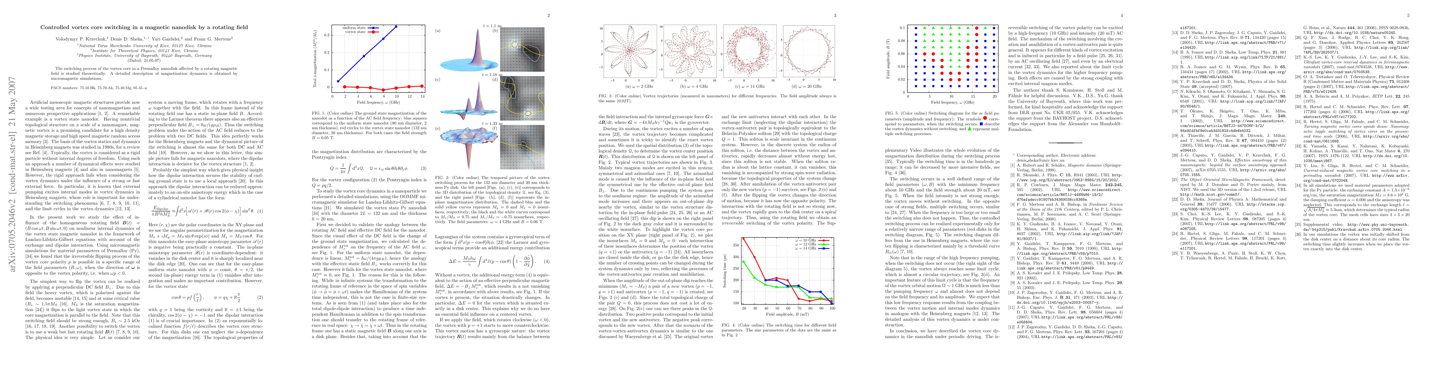 Summary: This research theoretically investigates the controlled switching of a vortex core in a Permalloy nanodisk using a rotating magnetic field, employing micromagnetic simulations to detail the magnetization dynamics involved.