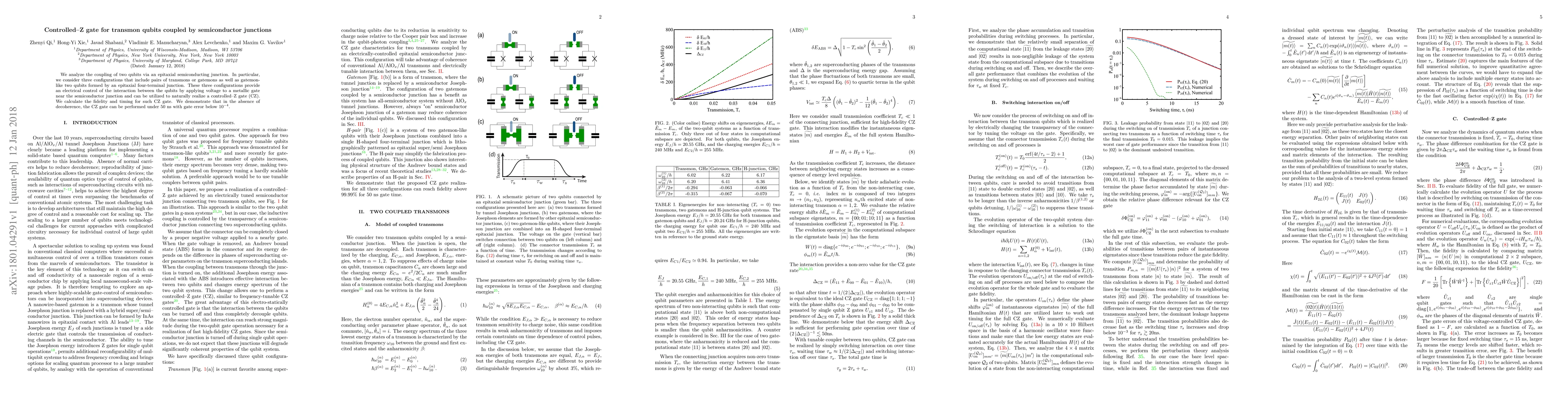 This paper investigates the controlled-Z gate implementation using transmon qubits coupled via semiconductor junctions, analyzing three configurations for electrical control of qubit interaction. The study demonstrates a high-fidelity CZ gate operation under 50 ns with an error rate below $10^{-4}$ in ideal conditions.