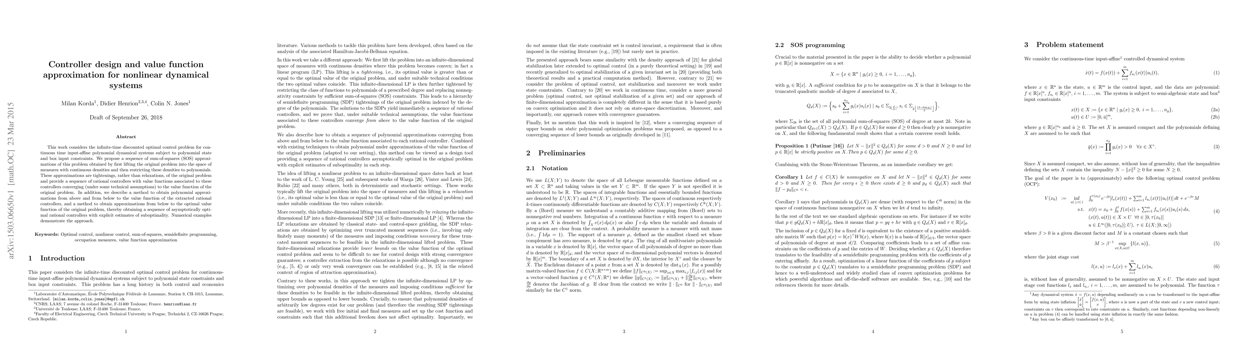 This work considers the infinite-time discounted optimal control problem for continuous time input-affine polynomial dynamical systems subject to polynomial state and box input constraints. We propose a sequence of sum-of-squares (SOS) approximations of this problem obtained by first lifting the original problem into the space of measures with continuous densities and then restricting these densities to polynomials. These approximations are tightenings, rather than relaxations, of the original problem and provide a sequence of rational controllers with value functions associated to these controllers converging (under some technical assumptions) to the value function of the original problem. In addition, we describe a method to obtain polynomial approximations from above and from below to the value function of the extracted rational controllers, and a method to obtain approximations from below to the optimal value function of the original problem, thereby obtaining a sequence of asymptotically optimal rational controllers with explicit estimates of suboptimality. Numerical examples demonstrate the approach.