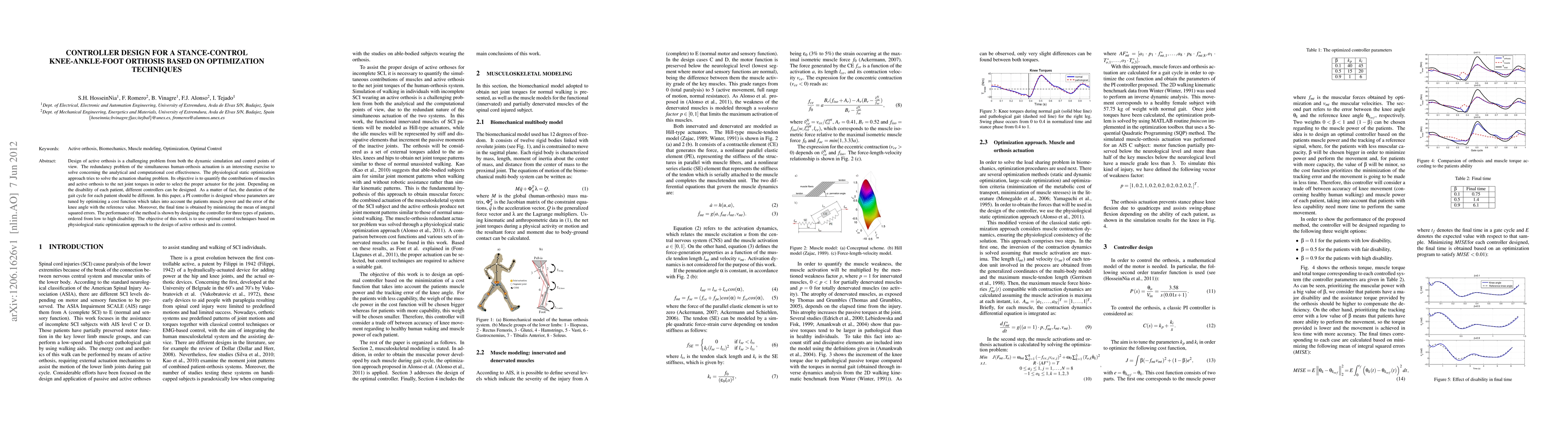 Design of active orthosis is a challenging problem from both the dynamic simulation and control points of view. The redundancy problem of the simultaneous human-orthosis actuation is an interesting exercise to solve concerning the analytical and computational cost effectiveness. The physiological static optimization approach tries to solve the actuation sharing problem. Its objective is to quantify the contributions of muscles and active orthosis to the net joint torques in order to select the proper actuator for the joint. Depending on the disability of each patient, different controllers can be designed. As a matter of fact, the duration of the gait cycle for each patient should be different. In this paper, a PI controller is designed whose parameters are tuned by optimizing a cost function which takes into account the patients muscle power and the error of the knee angle with the reference value. Moreover, the final time is obtained by minimizing the mean of integral squared errors. The performance of the method is shown by designing the controller for three types of patients, ordered from low to high disability. The objective of this work is to use optimal control techniques based on physiological static optimization approach to the design of active orthosis and its control.