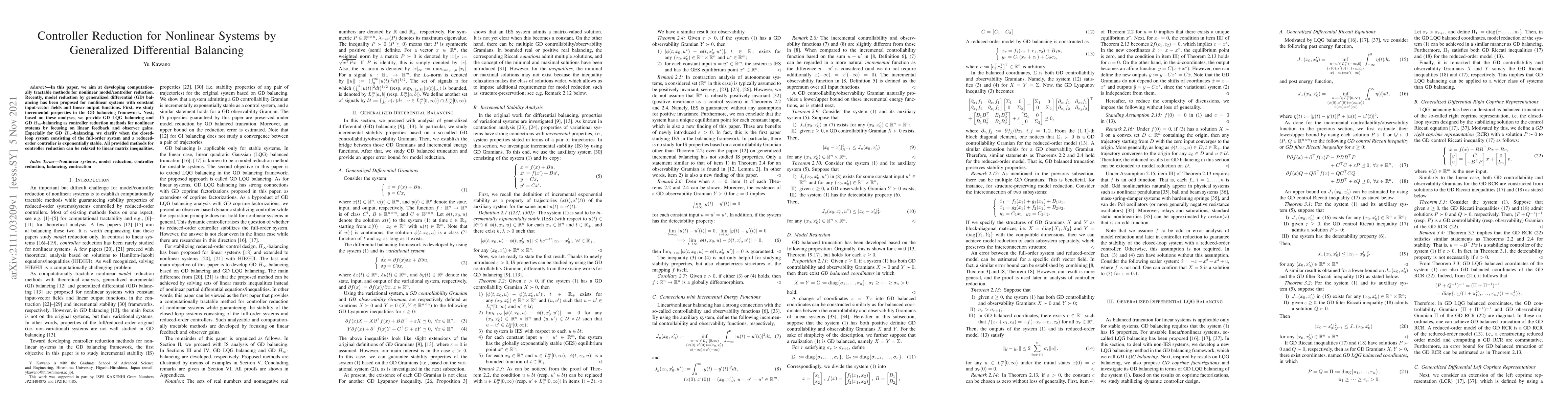 Researchers developed methods for reducing complex nonlinear systems to simpler controllers using generalized differential balancing, focusing on stability and applicability of linear matrix inequalities.