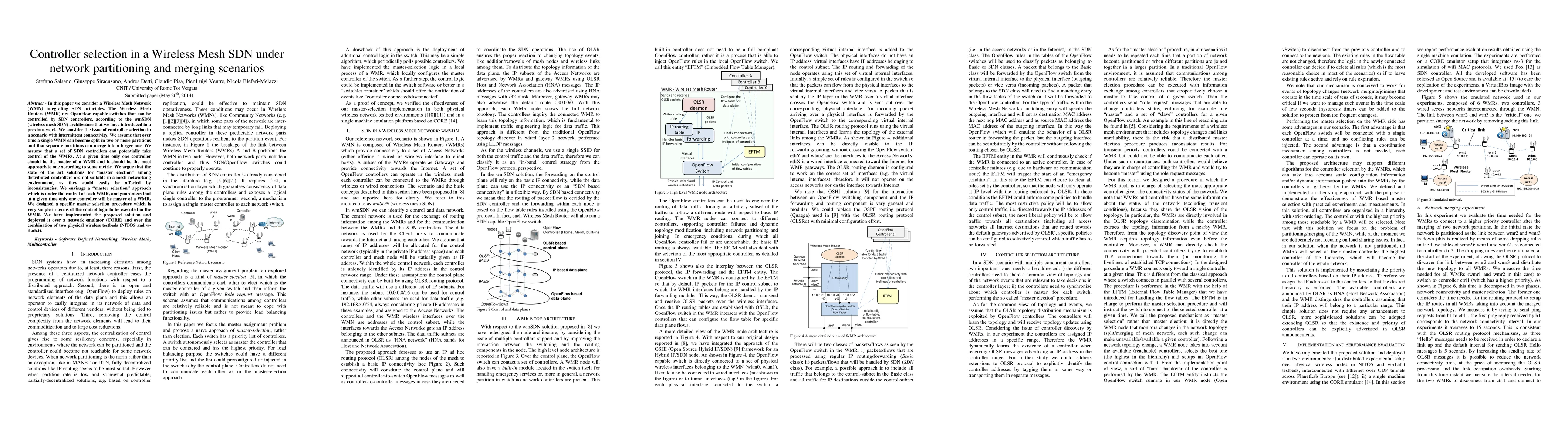 This paper proposes a novel controller selection mechanism for wireless mesh networks integrating SDN principles, addressing the challenges of network partitioning and merging. It introduces a simple master selection procedure controlled by each Wireless Mesh Router to ensure only one controller is the master at any given time, implemented and tested in a network emulator and physical testbeds.