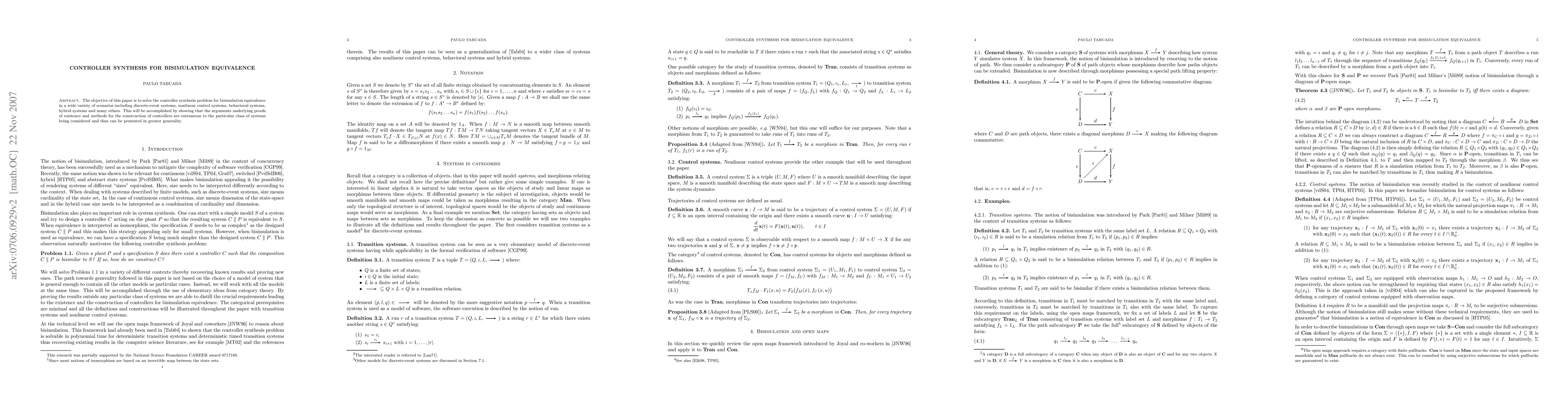 This paper addresses controller synthesis for bisimulation equivalence across diverse systems, demonstrating that the underlying principles and methods are universally applicable regardless of the system type, thereby presenting a generalized approach.
