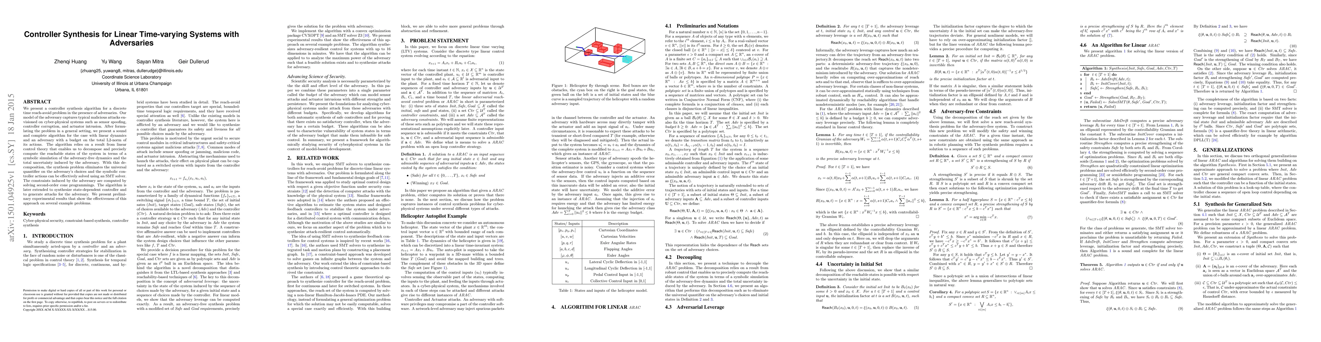 This paper proposes a controller synthesis algorithm for linear time-varying systems facing adversaries, addressing attacks like sensor spoofing. The algorithm decomposes reachable states and uses an SMT solver to synthesize controllers while considering the adversary's L2-norm budget, and extends to state-dependent controllers and attack generation.