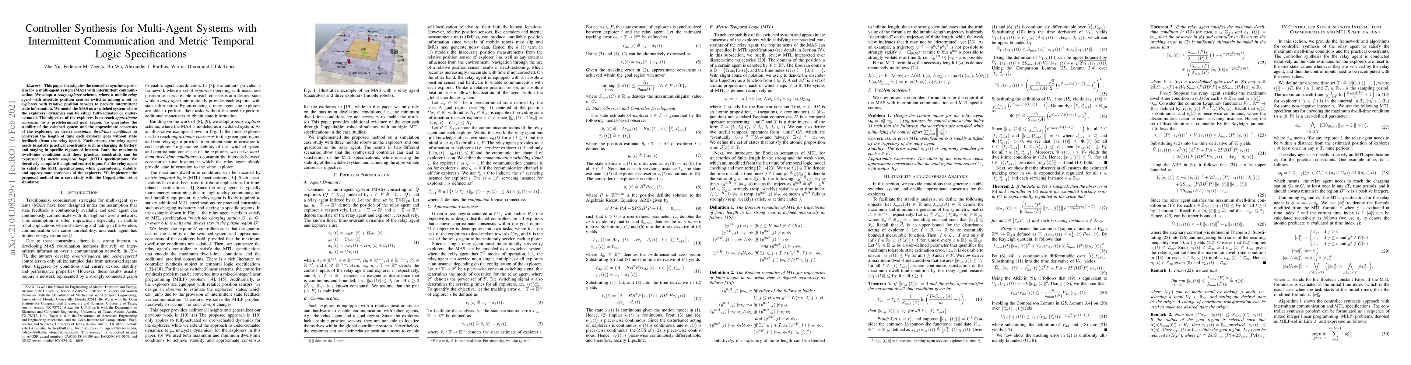 This paper addresses controller synthesis for multi-agent systems with intermittent communication, employing a relay-explorer scheme to ensure stability and approximate consensus. It uses metric temporal logic specifications to manage relay agent constraints and iteratively computes optimal control inputs.