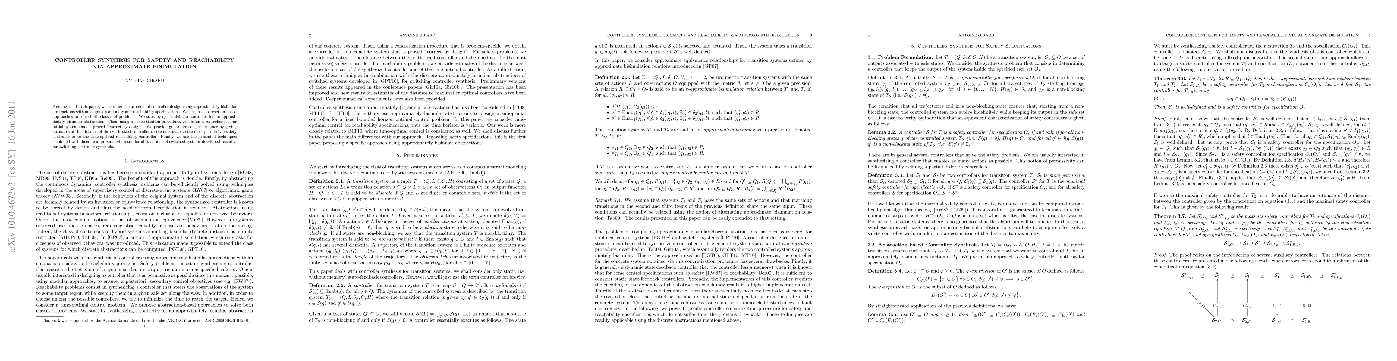 This paper proposes abstraction-based methods for controller synthesis focusing on safety and reachability, utilizing approximate bisimulation. The approach synthesizes a controller for an approximate abstraction and concretizes it to ensure correctness by design, providing performance guarantees.