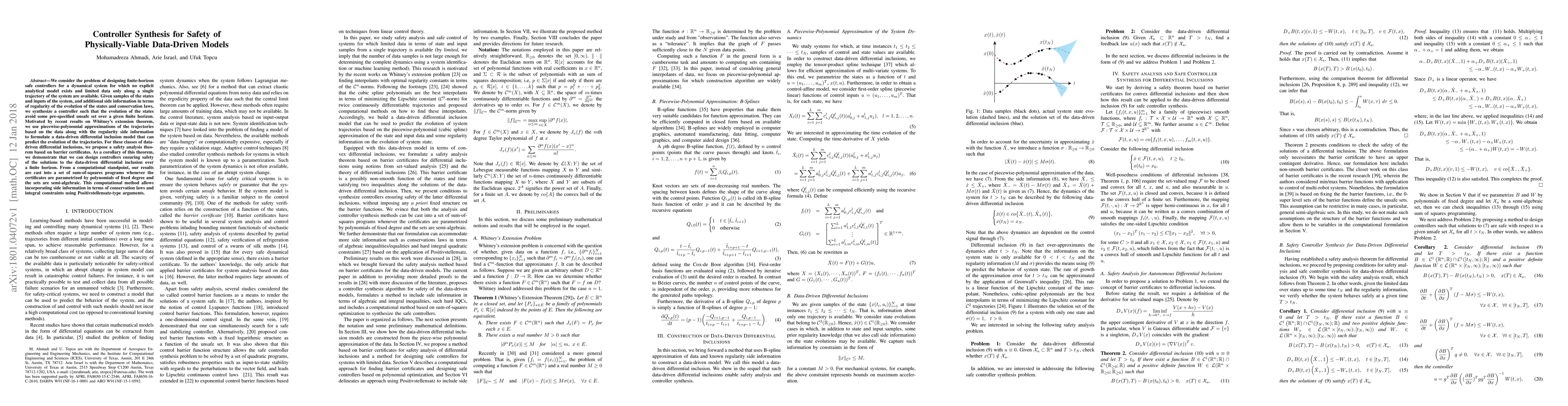 We consider the problem of designing finite-horizon safe controllers for a dynamical system for which no explicit analytical model exists and limited data only along a single trajectory of the system are available. Given samples of the states and inputs of the system, and additional side information in terms of regularity of the evolution of the states and conservation laws, we synthesize a controller such that the evolution of the states avoid some pre-specified unsafe set over a given finite horizon. Motivated by recent results on Whitney's extension theorem, we use piecewise-polynomial approximations of the trajectories based on the data along with the regularity side information to formulate a data-driven differential inclusion model that can predict the evolution of the trajectories. For these classes of data- driven differential inclusions, we propose a safety analysis theorem based on barrier certificates. As a corollary of this theorem, we demonstrate that we can design controllers ensuring safety of the solutions to the data-driven differential inclusion over a finite horizon. From a computational standpoint, our results are cast into a set of sum-of-squares programs whenever the certificates are parametrized by polynomials of fixed degree and the sets are semi-algebraic. This computational method allows incorporating side information in terms of conservation laws and integral constraints using Positivstellensatz-type arguments.