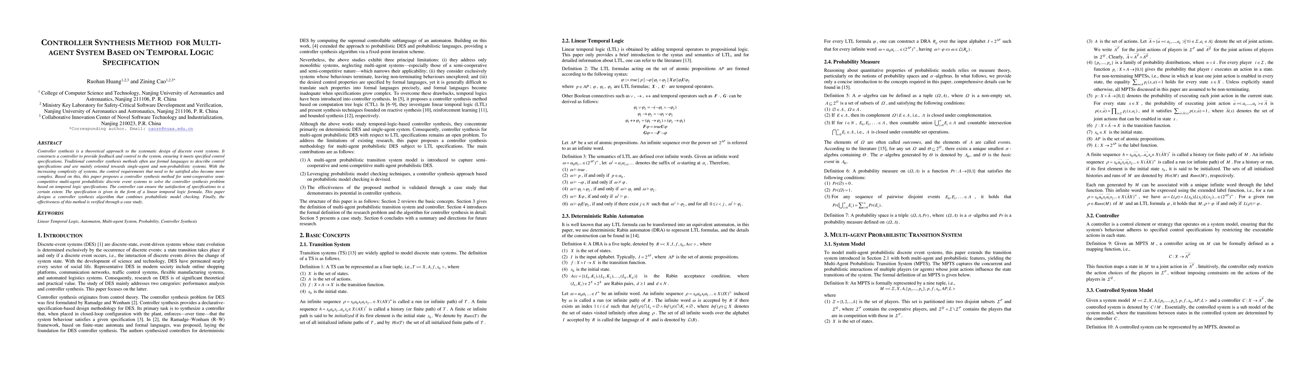 Controller synthesis is a theoretical approach to the systematic design of discrete event systems. It constructs a controller to provide feedback and control to the system, ensuring it meets specified control specifications. Traditional controller synthesis methods often use formal languages to describe control specifications and are mainly oriented towards single-agent and non-probabilistic systems. With the increasing complexity of systems, the control requirements that need to be satisfied also become more complex. Based on this, this paper proposes a controller synthesis method for semi-cooperative semi-competitive multi-agent probabilistic discrete event systems to solve the controller synthesis problem based on temporal logic specifications. The controller can ensure the satisfaction of specifications to a certain extent. The specification is given in the form of a linear temporal logic formula. This paper designs a controller synthesis algorithm that combines probabilistic model checking. Finally, the effectiveness of this method is verified through a case study.