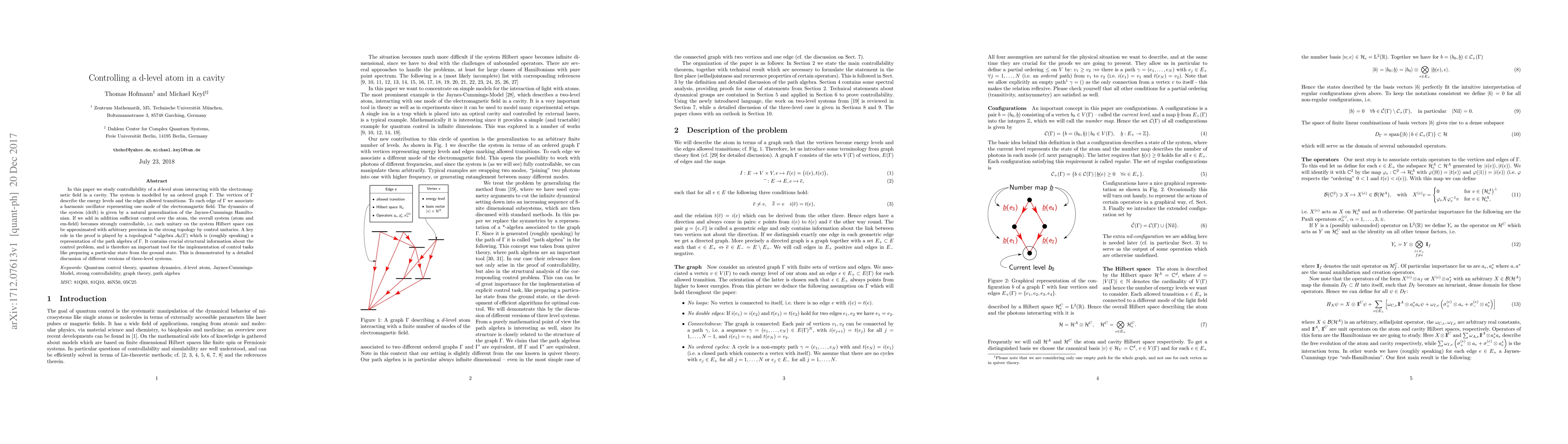 The paper introduces a novel method for controlling a d-level atom in a cavity using an ordered graph representation and a topological *-algebra, providing a comprehensive framework for quantum state control.