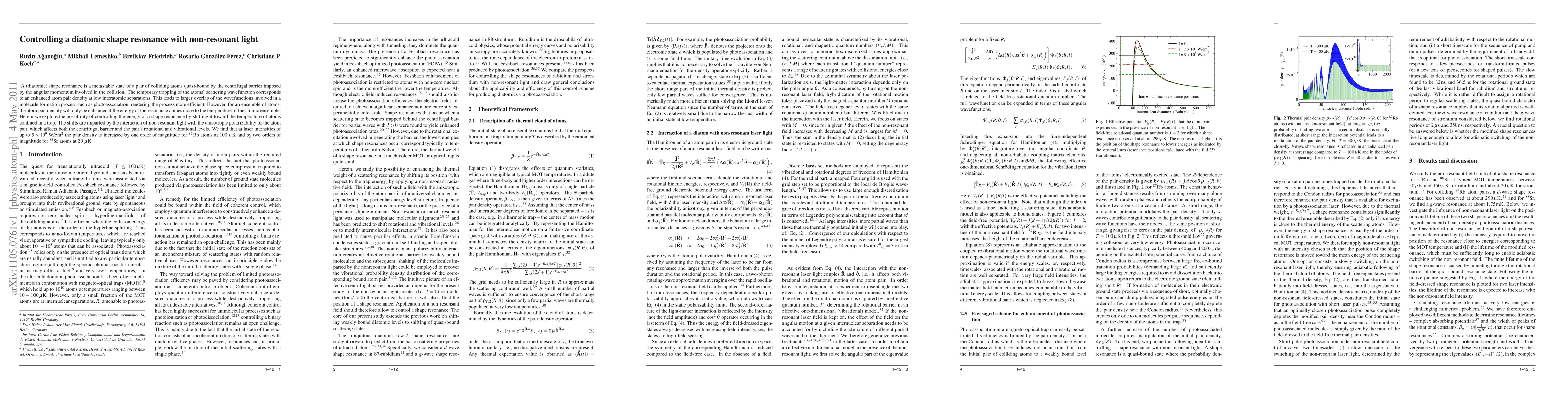 This paper explores controlling diatomic shape resonances using non-resonant light to shift their energy, enhancing the efficiency of molecule formation processes. The study demonstrates significant increases in atom pair density for $^{87}$Rb and $^{88}$Sr atoms at low temperatures through the interaction of light with the anisotropic polarizability of the atom pairs.