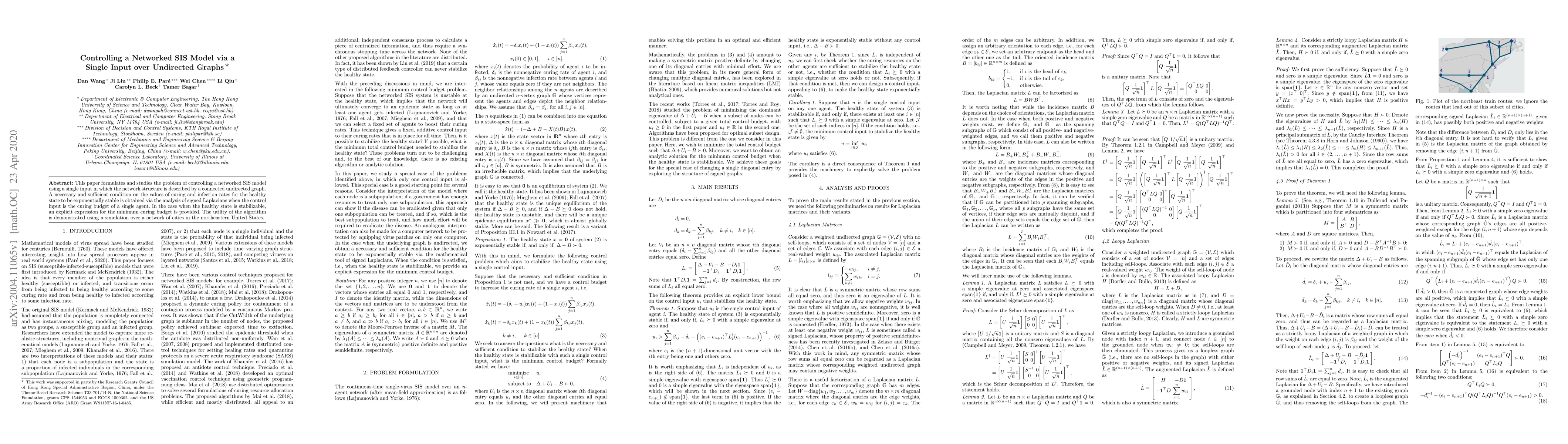 This paper formulates and studies the problem of controlling a networked SIS model using a single input in which the network structure is described by a connected undirected graph. A necessary and sufficient condition on the values of curing and infection rates for the healthy state to be exponentially stable is obtained via the analysis of signed Laplacians when the control input is the curing budget of a single agent. In the case when the healthy state is stabilizable, an explicit expression for the minimum curing budget is provided. The utility of the algorithm is demonstrated using a simulation over a network of cities in the northeastern United States.