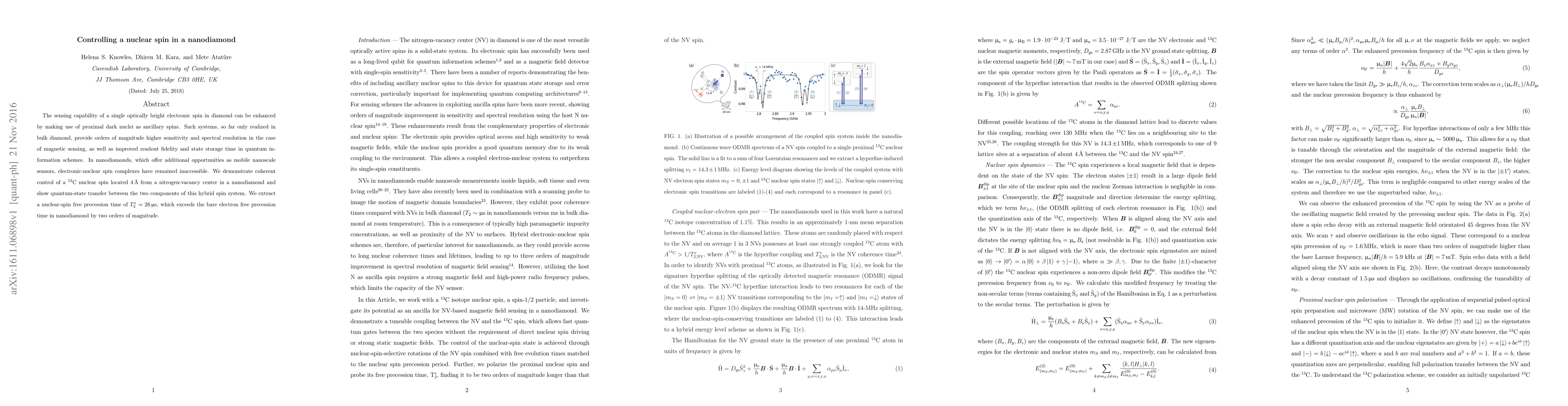 The sensing capability of a single optically bright electronic spin in diamond can be enhanced by making use of proximal dark nuclei as ancillary spins. Such systems, so far only realized in bulk diamond, provide orders of magnitude higher sensitivity and spectral resolution in the case of magnetic sensing, as well as improved readout fidelity and state storage time in quantum information schemes. In nanodiamonds, which offer additional opportunities as mobile nanoscale sensors, electronic-nuclear spin complexes have remained inaccessible. We demonstrate coherent control of a 13C nuclear spin located 4{\AA} from a nitrogen-vacancy center in a nanodiamond and show quantum-state transfer between the two components of this hybrid spin system. We extract a nuclear-spin free precession time of T2* = 26 us, which exceeds the bare electron free precession time in nanodiamond by two orders of magnitude.