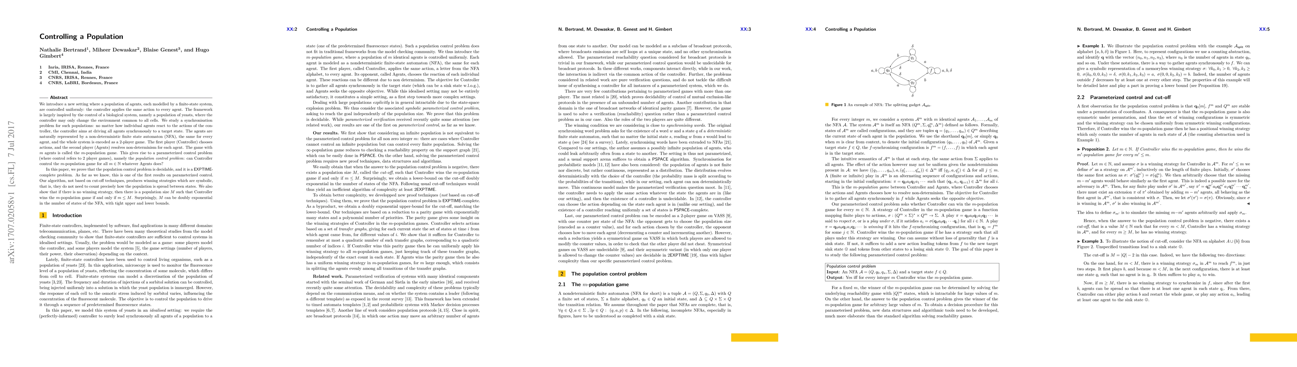 This research introduces a novel control problem for populations of agents, each modeled as finite-state systems. The controller uniformly influences all agents via shared environment changes. The study focuses on synchronizing these agents to a target state, represented as a 2-player game called the m-population game. The paper proves this population control problem is decidable and EXPTIME-complete, presenting an algorithm that generates symbolic winning strategies. Surprisingly, the algorithm identifies a threshold population size M, which can be doubly exponential in the NFA's number of states, determining Controller's winning condition.