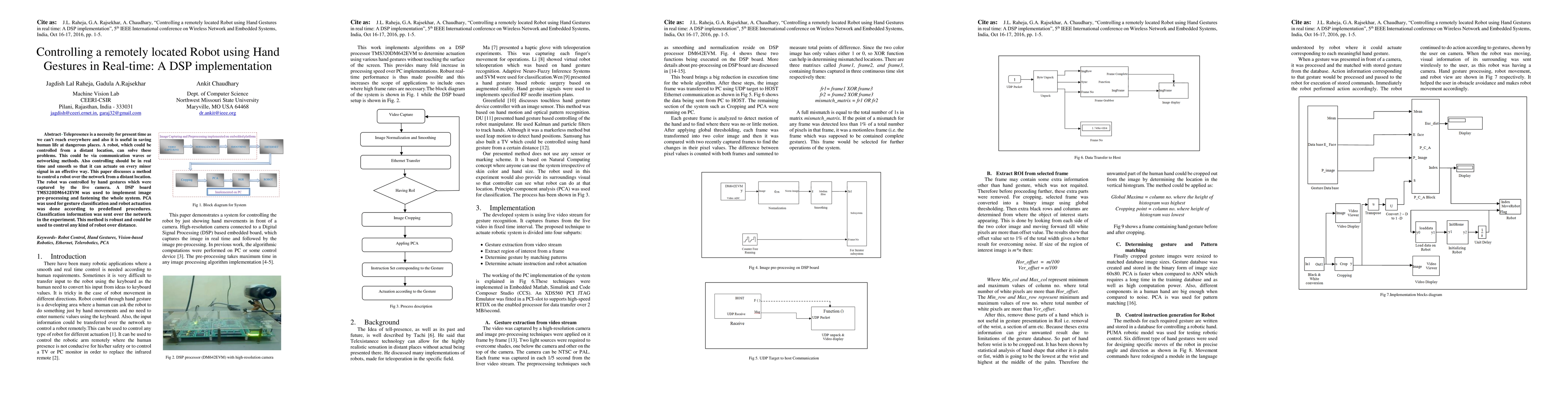 This paper presents a method to control a remote robot using hand gestures in real-time via a Digital Signal Processor (DSP) board, TMS320DM642EVM. The system utilizes PCA for gesture classification and network transmission, enabling smooth, responsive robot actuation from a distance, applicable to various robot types.