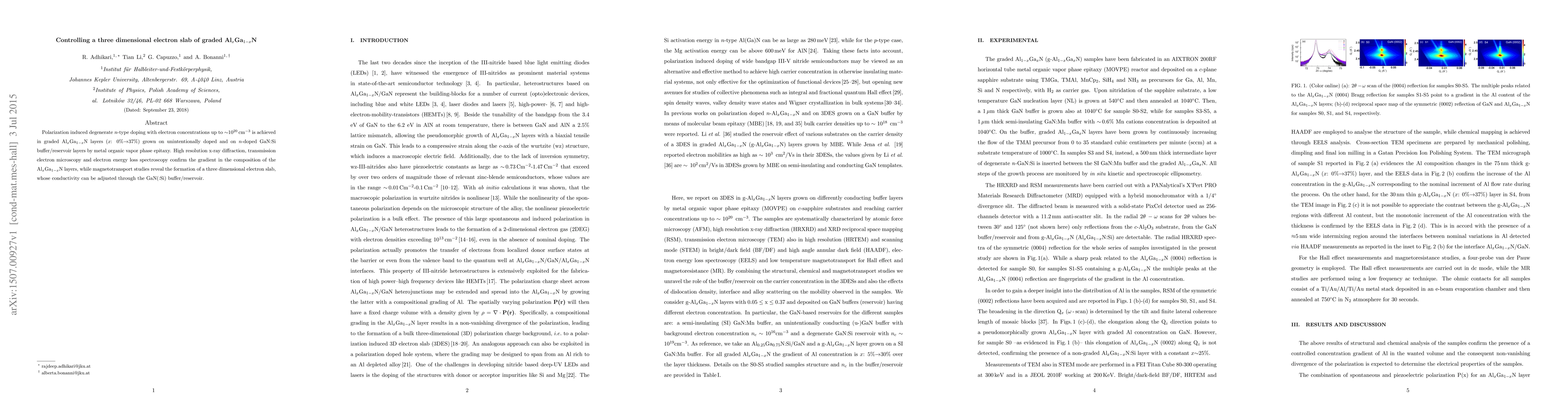 This paper reports on the polarization-induced degenerate $n$-type doping in graded Al$_{x}$Ga$_{1-x}$N layers, achieving electron concentrations up to $\sim$10$^{20}$ cm$^{-3}$. The study confirms the compositional gradient via high-resolution x-ray diffraction and TEM, and reveals a tunable three-dimensional electron slab through magnetotransport studies.