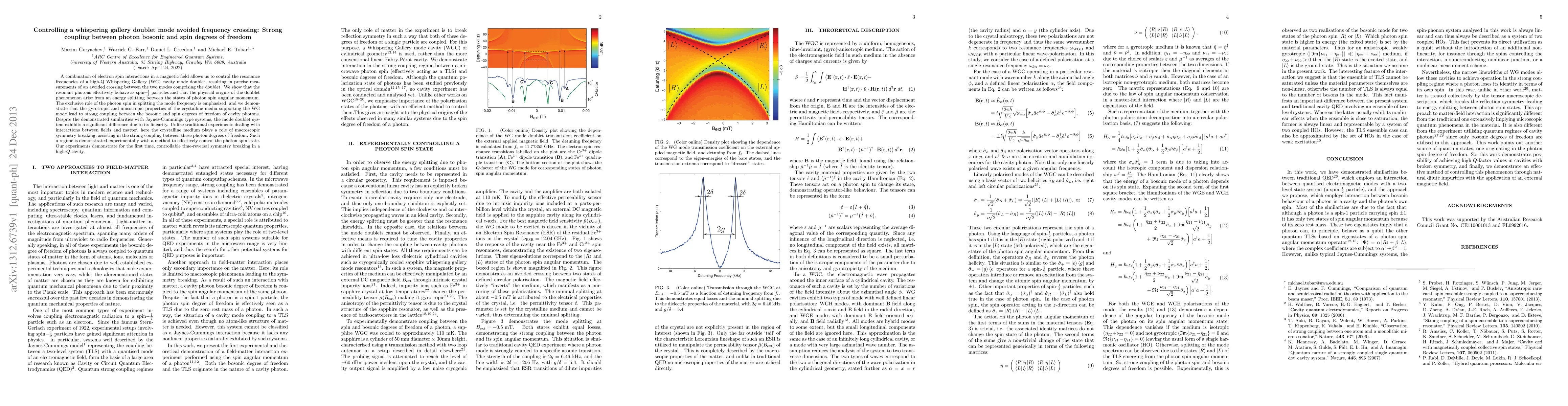 A combination of electron spin interactions in a magnetic field allows us to control the resonance frequencies of a high-Q Whispering Gallery (WG) cavity mode doublet, resulting in precise measurements of an avoided crossing between the two modes comprising the doublet. We show that the resonant photons effectively behave as spin--$\frac{1}{2}$ particles and that the physical origins of the doublet phenomenon arise from an energy splitting between the states of photon spin angular momentum. The exclusive role of the photon spin in splitting the mode frequency is emphasized, and we demonstrate that the gyrotropic and anisotropic properties of the crystalline media supporting the WG mode lead to strong coupling between the bosonic and spin degrees of freedom of cavity photons. Despite the demonstrated similarities with Jaynes-Cummings type systems, the mode doublet system exhibits a significant difference due to its linearity. Unlike traditional experiments dealing with interactions between fields and matter, here the crystalline medium plays a role of macroscopic symmetry breaking, assisting in the strong coupling between these photon degrees of freedom. Such a regime is demonstrated experimentally with a method to effectively control the photon spin state. Our experiments demonstrate for the first time, controllable time-reversal symmetry breaking in a high-$Q$ cavity.