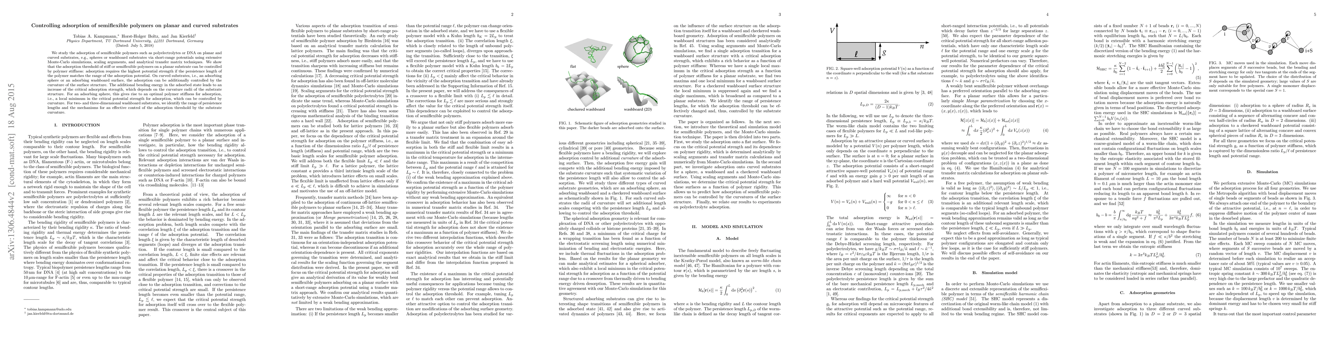 This paper explores the adsorption of semiflexible polymers on planar and curved surfaces using simulations and analytical techniques. It finds that polymer stiffness and the range of adsorption potentials control adsorption on flat surfaces, while curvature on spheres and washboard surfaces further modulates adsorption through bending energy, revealing optimal polymer stiffness for adsorption on curved substrates.