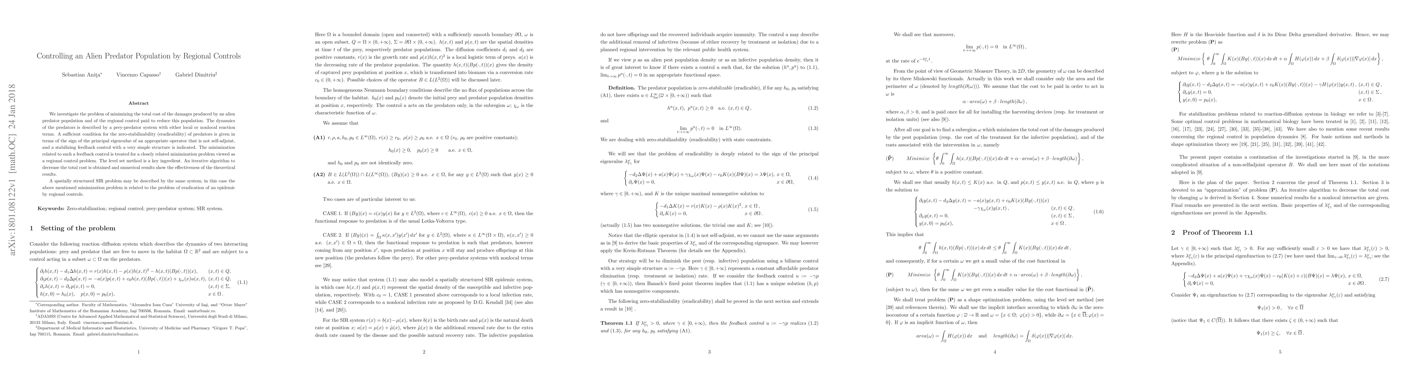 We investigate the problem of minimizing the total cost of the damages produced by an alien predator population and of the regional control paid to reduce this population. The dynamics of the predators is described by a prey-predator system with either local or nonlocal reaction terms. A sufficient condition for the zero-stabilizability (eradicability) of predators is given in terms of the sign of the principal eigenvalue of an appropriate operator that is not self-adjoint, and a stabilizing feedback control with a very simple structure is indicated. The minimization related to such a feedback control is treated for a closely related minimization problem viewed as a regional control problem. The level set method is a key ingredient. An iterative algorithm to decrease the total cost is obtained and numerical results show the effectiveness of the theoretical results. A spatially structured SIR problem may be described by the same system; in this case the above mentioned minimization problem is related to the problem of eradication of an epidemic by regional controls.