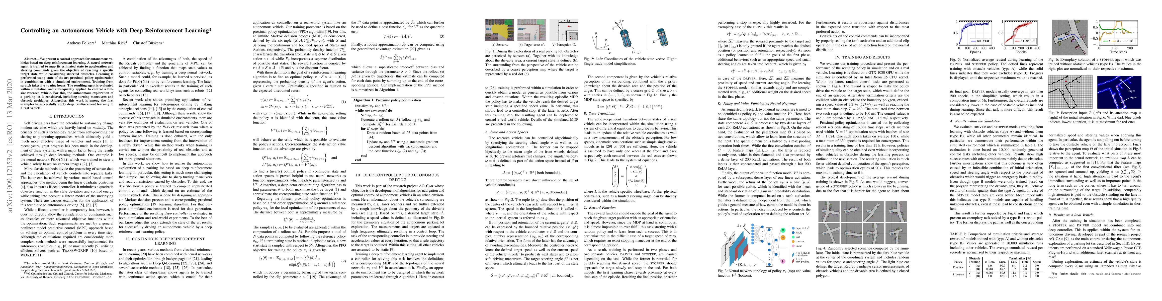 We present a control approach for autonomous vehicles based on deep reinforcement learning. A neural network agent is trained to map its estimated state to acceleration and steering commands given the objective of reaching a specific target state while considering detected obstacles. Learning is performed using state-of-the-art proximal policy optimization in combination with a simulated environment. Training from scratch takes five to nine hours. The resulting agent is evaluated within simulation and subsequently applied to control a full-size research vehicle. For this, the autonomous exploration of a parking lot is considered, including turning maneuvers and obstacle avoidance. Altogether, this work is among the first examples to successfully apply deep reinforcement learning to a real vehicle.