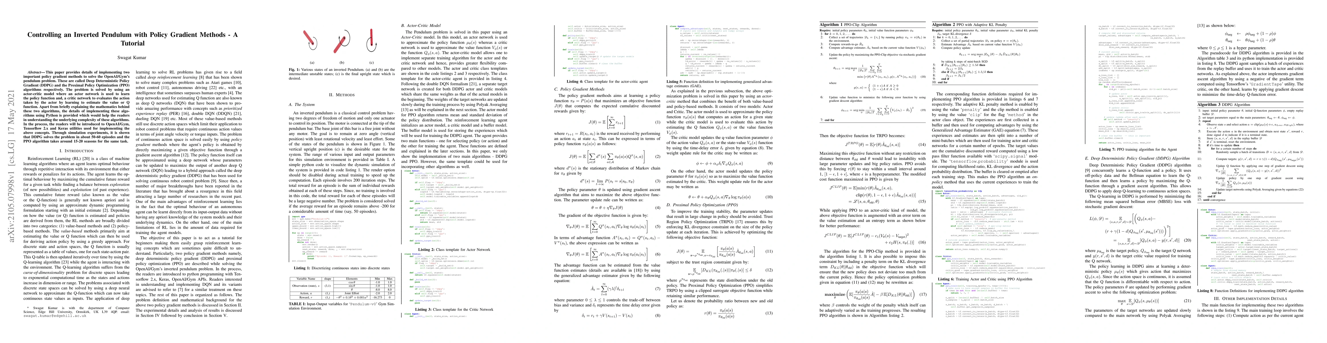 This paper details the implementation of Deep Deterministic Policy Gradient (DDPG) and Proximal Policy Optimization (PPO) for controlling an inverted pendulum, using actor-critic models and Python tools like TensorFlow 2.x and Keras, alongside an introduction to the OpenAI/Gym environment. It aims to demystify the complexity of these policy gradient methods through practical examples.