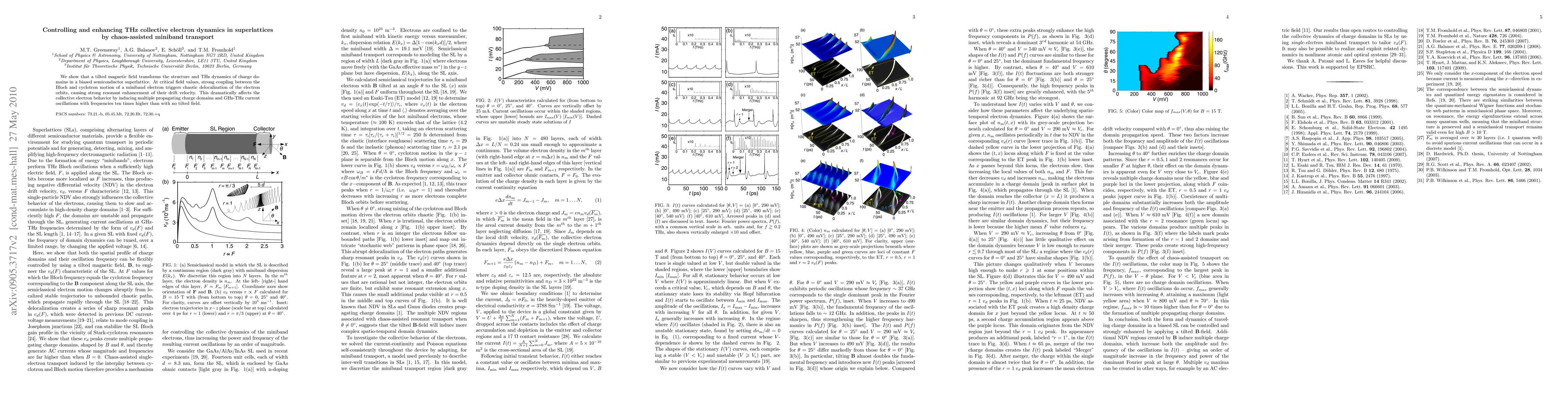 This paper demonstrates that applying a tilted magnetic field to a biased semiconductor superlattice induces chaotic miniband transport, significantly enhancing THz collective electron dynamics and generating GHz-THz current oscillations. The critical field values trigger chaotic delocalization and resonant drift velocity enhancement, resulting in multiple propagating charge domains.