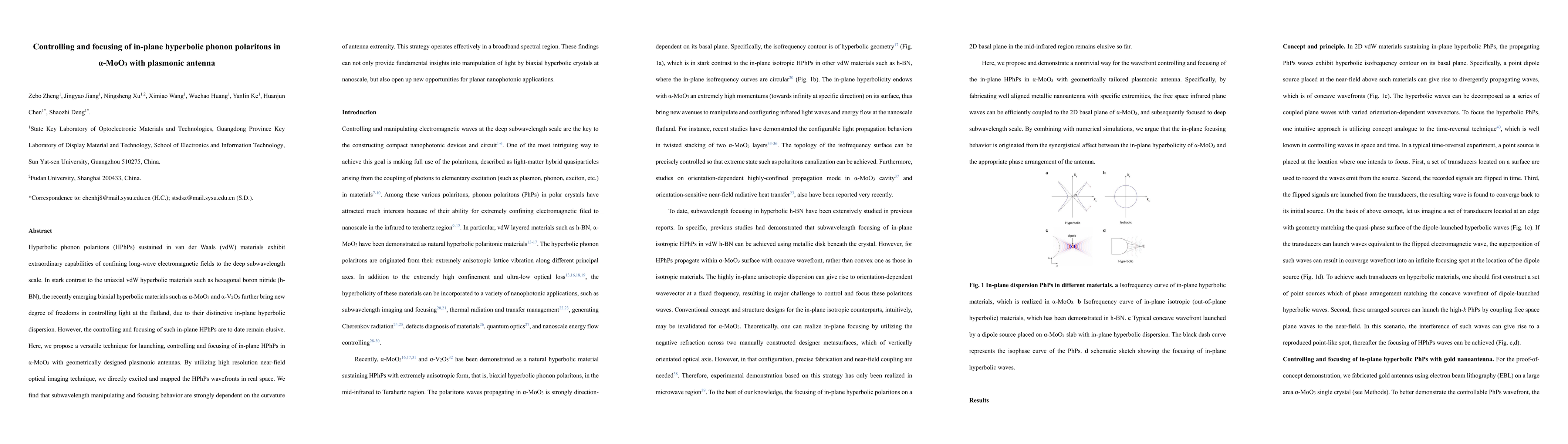 This paper proposes a method to control and focus in-plane hyperbolic phonon polaritons in α-MoO3 using geometrically designed plasmonic antennas. The study demonstrates effective subwavelength manipulation and focusing of these phonon polaritons, which is crucial for advancing nanoscale light control in biaxial hyperbolic materials and for potential nanophotonic applications.