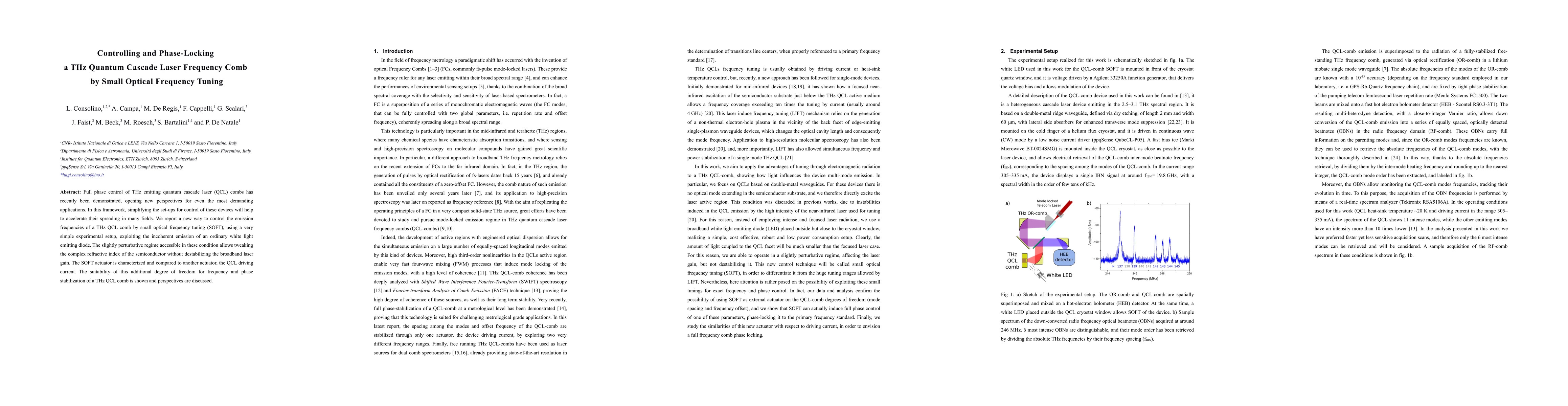 This paper presents a novel method for controlling the emission frequencies of a THz quantum cascade laser (QCL) comb using small optical frequency tuning (SOFT), which leverages an ordinary white light emitting diode. This method provides a simple setup for phase-locking and frequency stabilization without destabilizing the laser gain, offering new perspectives for practical applications.