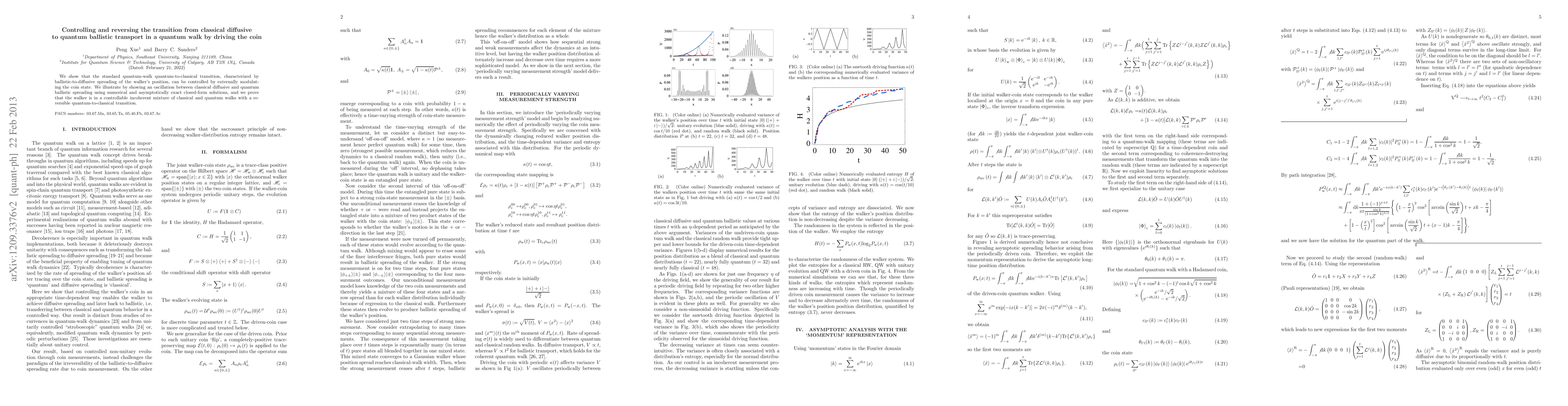 This paper demonstrates how modulating the coin state in a quantum walk can control the transition from classical diffusive to quantum ballistic transport, achieving reversible oscillation between these modes through numerical and analytical methods.