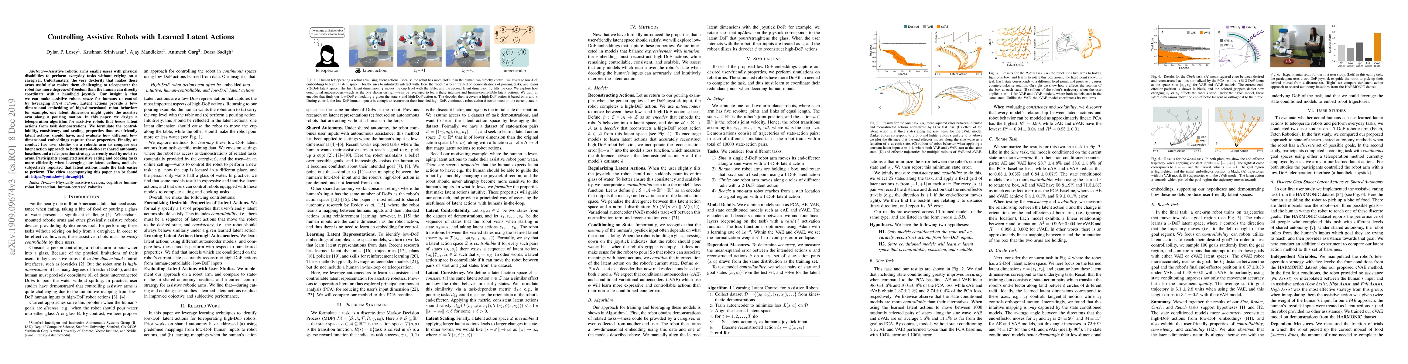 This paper proposes a teleoperation algorithm for assistive robots that learns latent actions from demonstrations to simplify control. The study finds that users perform tasks more efficiently and report easier control when using these learned low-dimensional embeddings compared to traditional teleoperation methods.