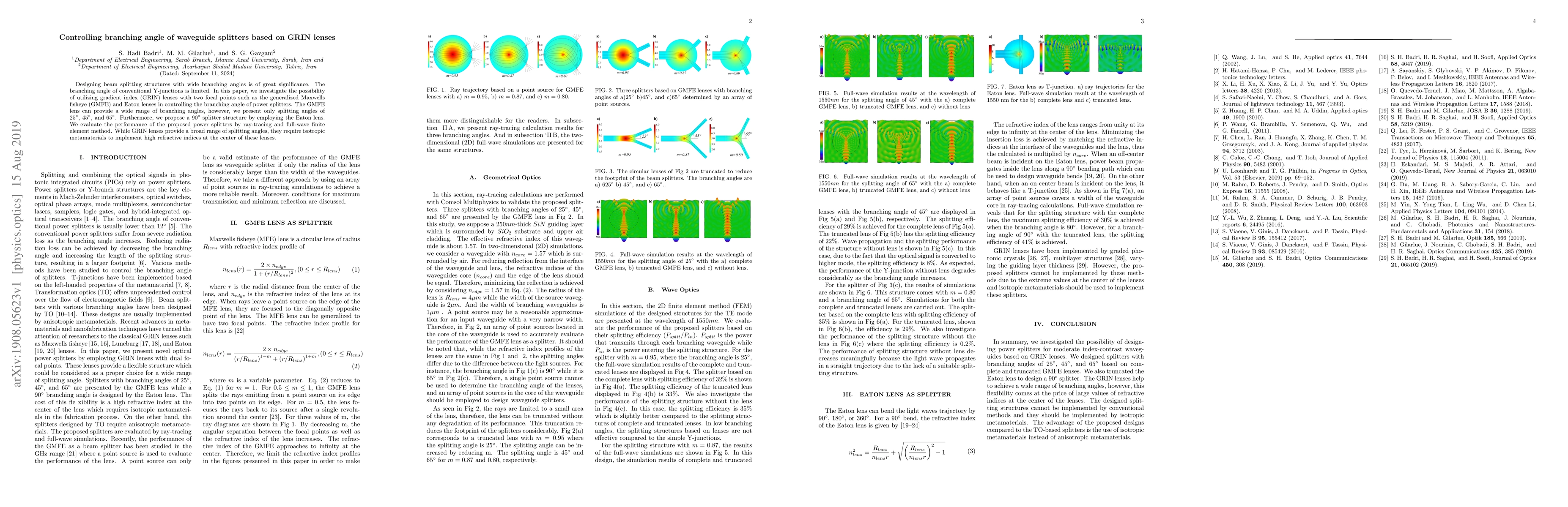 This paper explores the use of gradient index (GRIN) lenses, specifically generalized Maxwell's fisheye and Eaton lenses, to control the branching angle of waveguide splitters, achieving angles of 25$^\circ$, 45$^\circ$, and 65$^\circ$ with GMFE lenses and a 90$^\circ$ splitter with Eaton lenses. The performance is evaluated using ray-tracing and finite element methods, highlighting the need for isotropic metamaterials for high refractive indices.