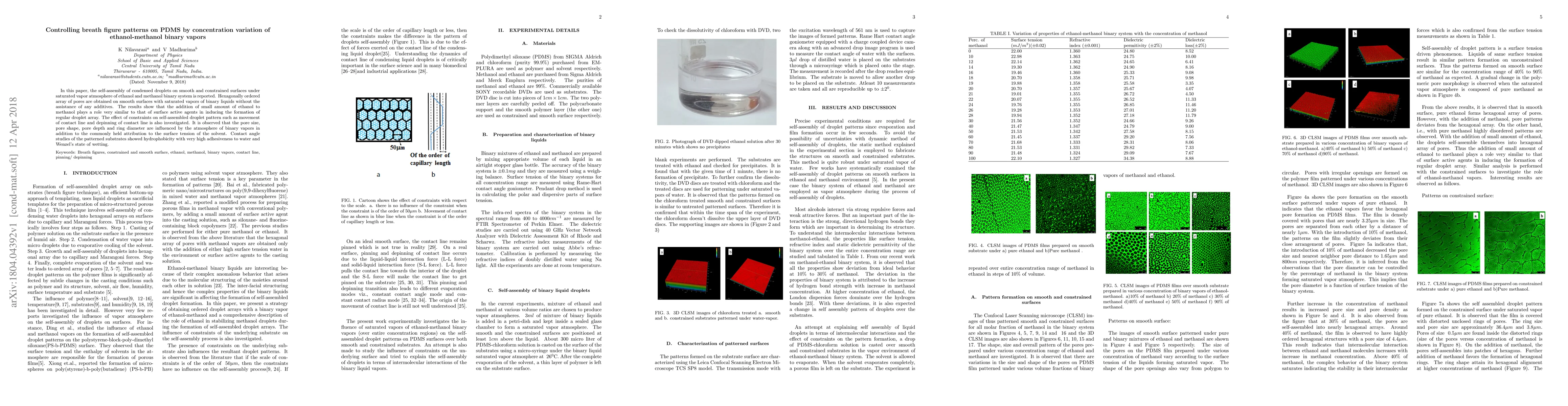 This paper explores the self-assembly of condensed droplets on PDMS surfaces under ethanol-methanol binary vapors, revealing that ethanol addition induces regular hexagonal pore arrays without additives. The study also investigates how constraints affect droplet pattern formation and shows that binary vapor composition influences pore characteristics beyond surface tension.