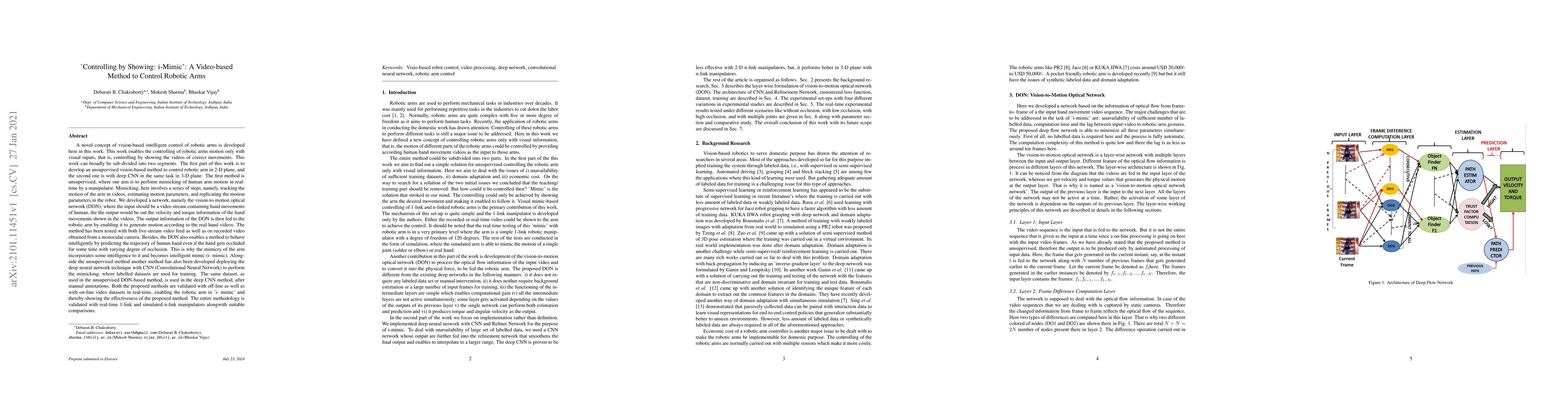 This paper introduces a vision-based method called i-Mimic for controlling robotic arms using video inputs. It presents two approaches: an unsupervised vision-to-motion optical network (DON) for 2-D plane control and a supervised deep CNN method for 3-D plane control, both validated with real-time datasets and real manipulators.