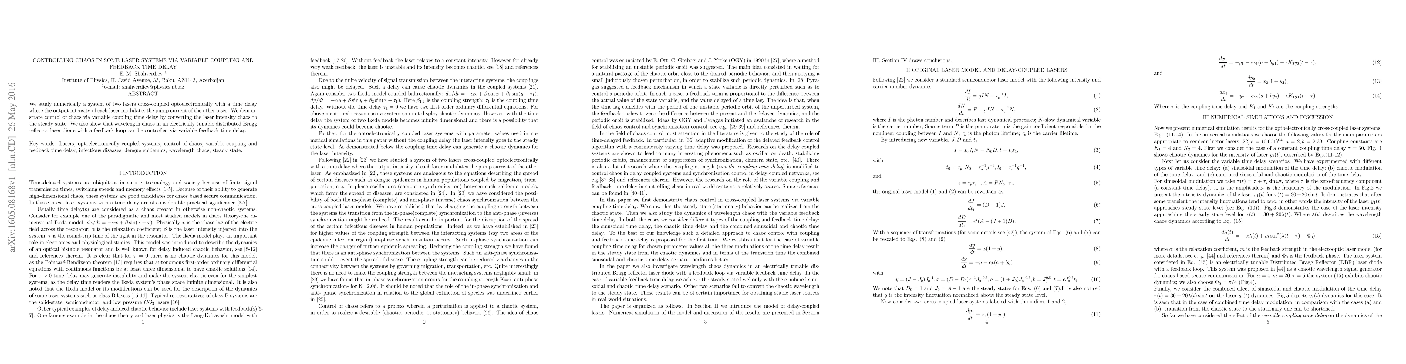 This paper numerically investigates a system of two optoelectronically cross-coupled lasers with time delay, demonstrating chaos control by adjusting the coupling time delay to convert chaotic intensity to a steady state. Additionally, it shows that wavelength chaos in an electrically tunable laser diode can be controlled via variable feedback time delay.