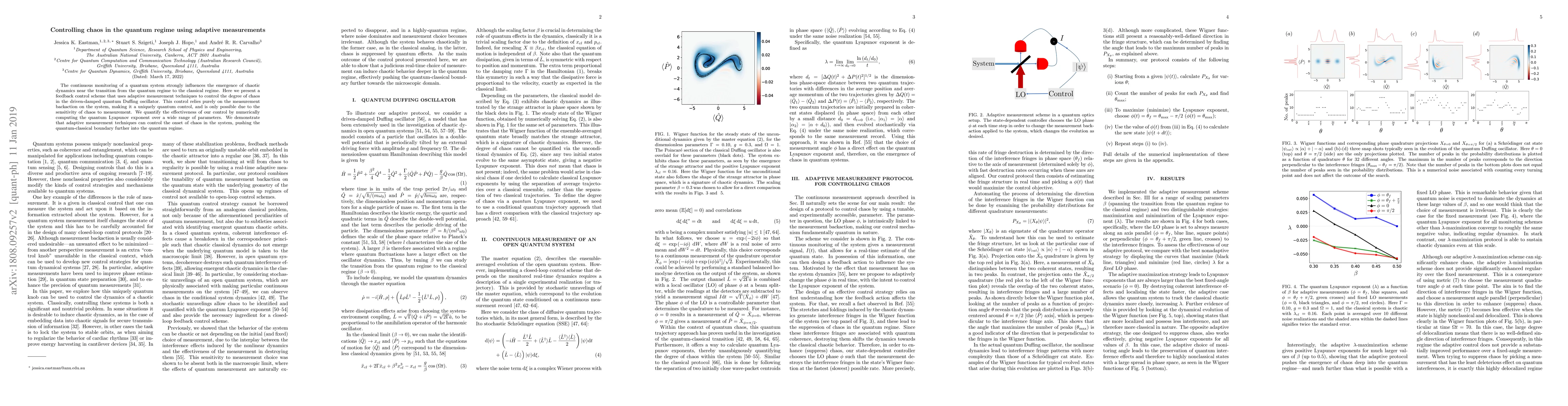 This paper proposes a feedback control scheme using adaptive measurement techniques to manage chaos in the quantum Duffing oscillator, demonstrating the ability to delay the onset of chaos and extend the quantum-classical boundary through measurement backaction. The effectiveness is quantified via numerical computation of the quantum Lyapunov exponent.