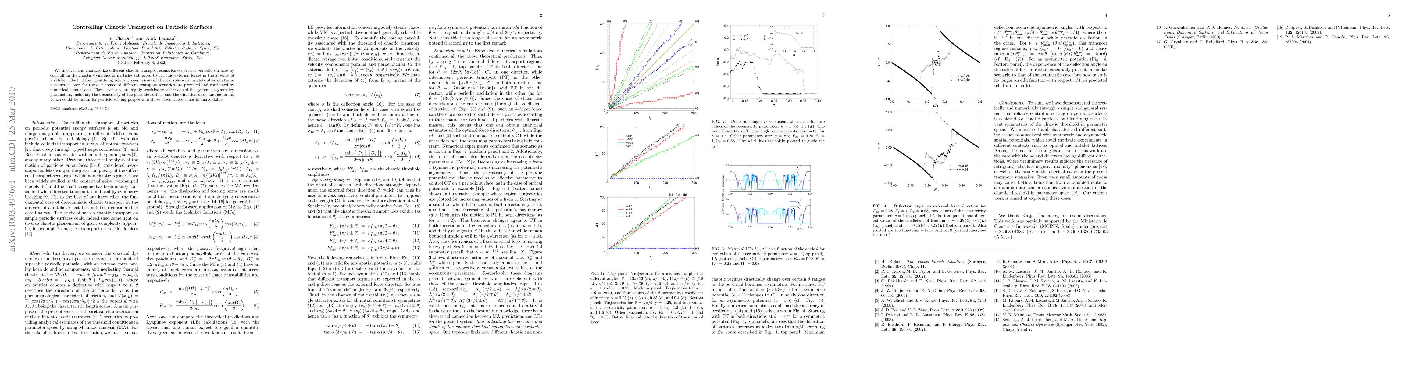 This paper investigates chaotic transport on periodic surfaces, identifying and characterizing various transport scenarios through controlled particle dynamics. Analytical and numerical results reveal that these scenarios are highly sensitive to system asymmetry parameters, suggesting potential applications in particle sorting where chaos is present.