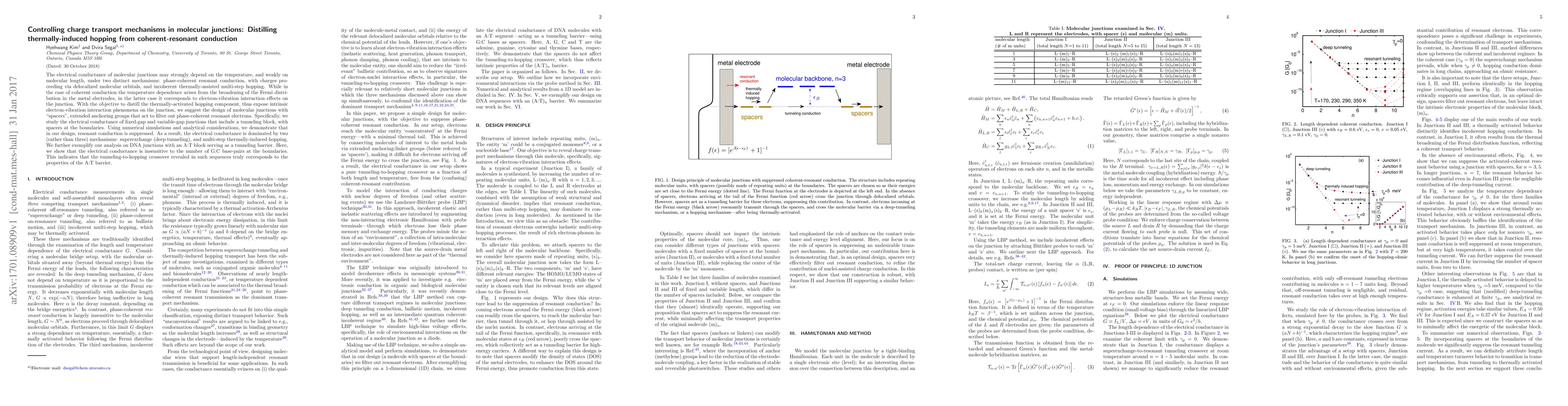 This paper investigates methods to isolate thermally-induced hopping from coherent resonant conduction in molecular junctions, proposing the use of "spacers" to filter out coherent electrons. Through simulations and analysis, it demonstrates that such spacers suppress resonant conduction, revealing that conductance is dominated by superexchange and thermally-induced hopping, as exemplified by DNA junctions with an A:T block.