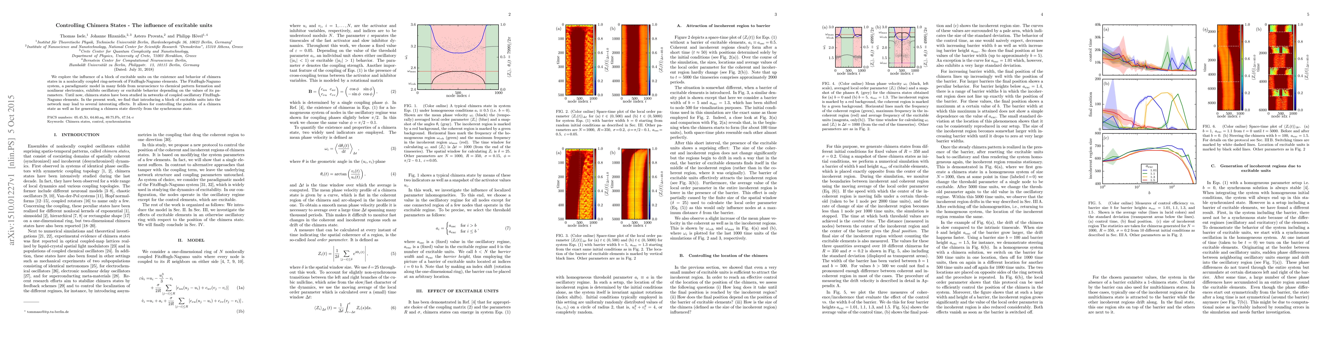 This paper investigates how a block of excitable units affects the emergence and dynamics of chimera states in a ring network of nonlocally coupled FitzHugh-Nagumo elements. The study reveals that such excitable units can control the location of chimera states and enable the transition from a synchronous state to a chimera state.