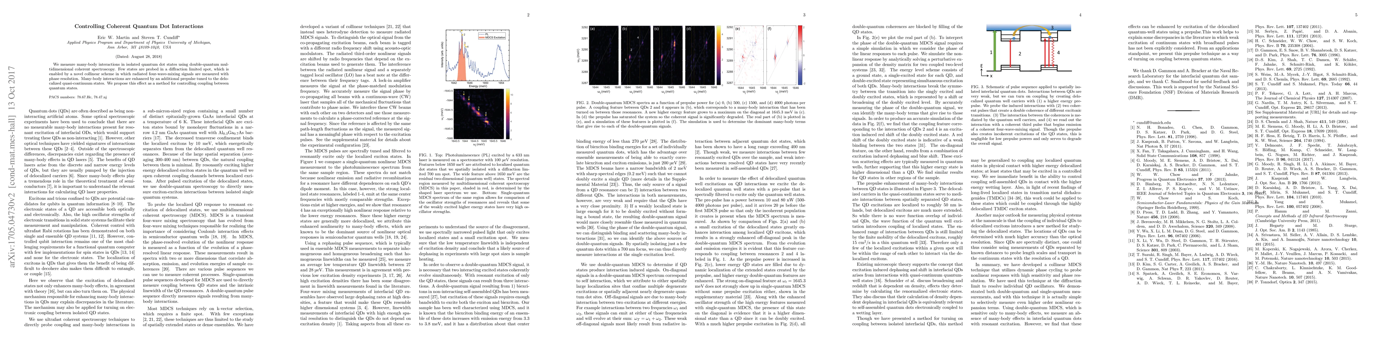 This research utilizes double-quantum multidimensional coherent spectroscopy to measure many-body interactions in isolated quantum dots, proposing a method to control coupling via enhanced interactions with a prepulse tuned to delocalized quasi-continuum states. The technique employs a novel collinear scheme for precise measurements.