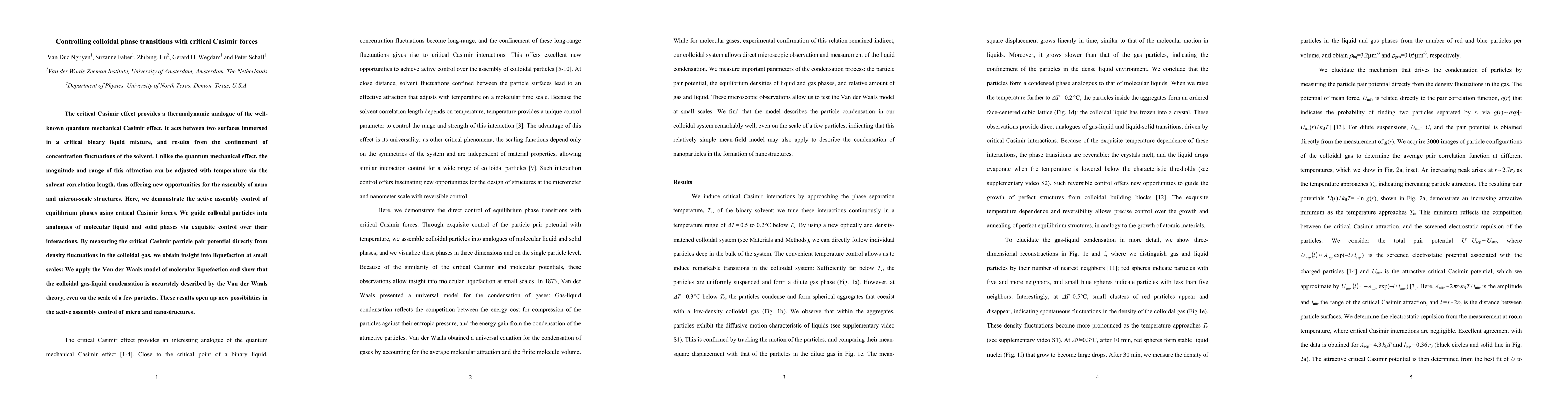 This paper demonstrates the use of critical Casimir forces to control colloidal phase transitions, guiding particles into liquid and solid phases. The study shows that the Van der Waals model accurately describes colloidal gas-liquid condensation, offering new methods for assembling micro and nanostructures.