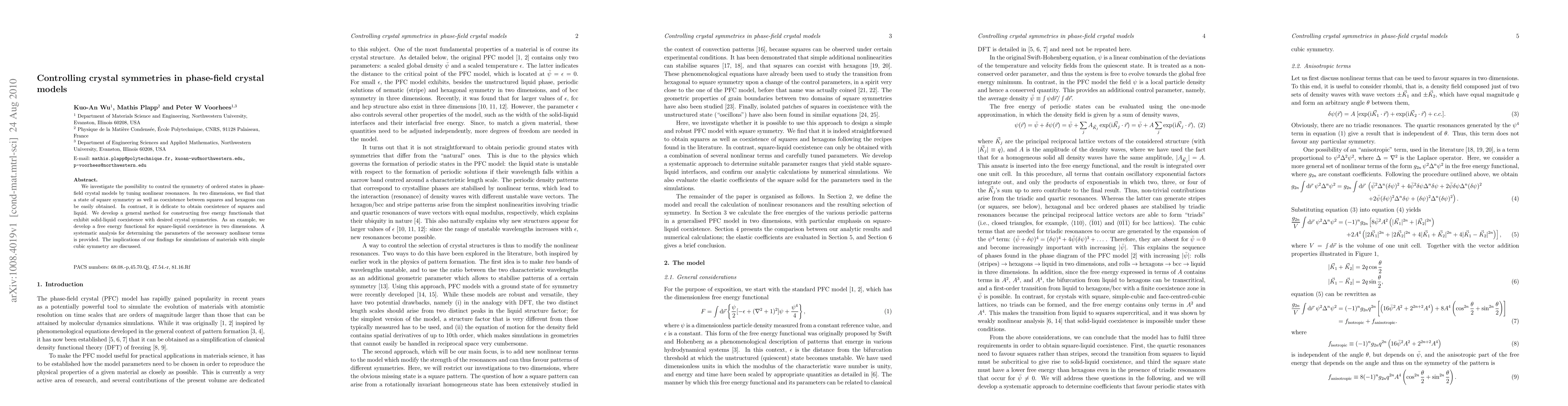 Researchers found ways to control symmetry in phase-field crystal models by tuning nonlinear resonances, allowing for coexistence of different crystal shapes like squares and hexagons, with implications for materials science simulations.