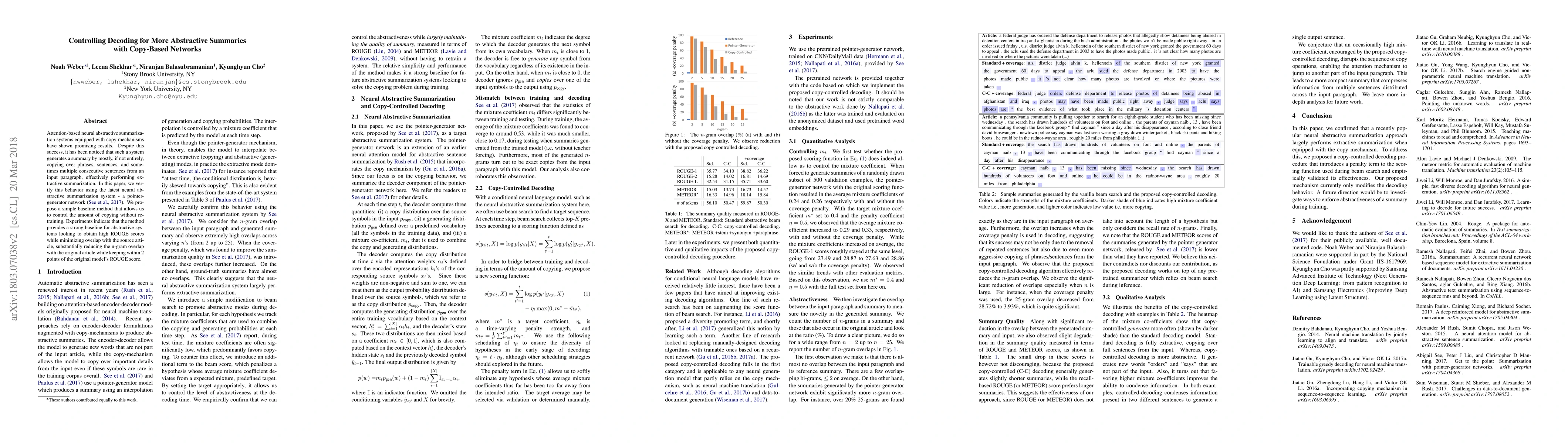 This paper explores controlling the decoding process in abstractive summarization networks to reduce excessive copying while maintaining high summarization quality. A proposed baseline method effectively minimizes overlap with the source text, achieving a balance between abstractiveness and ROUGE score.